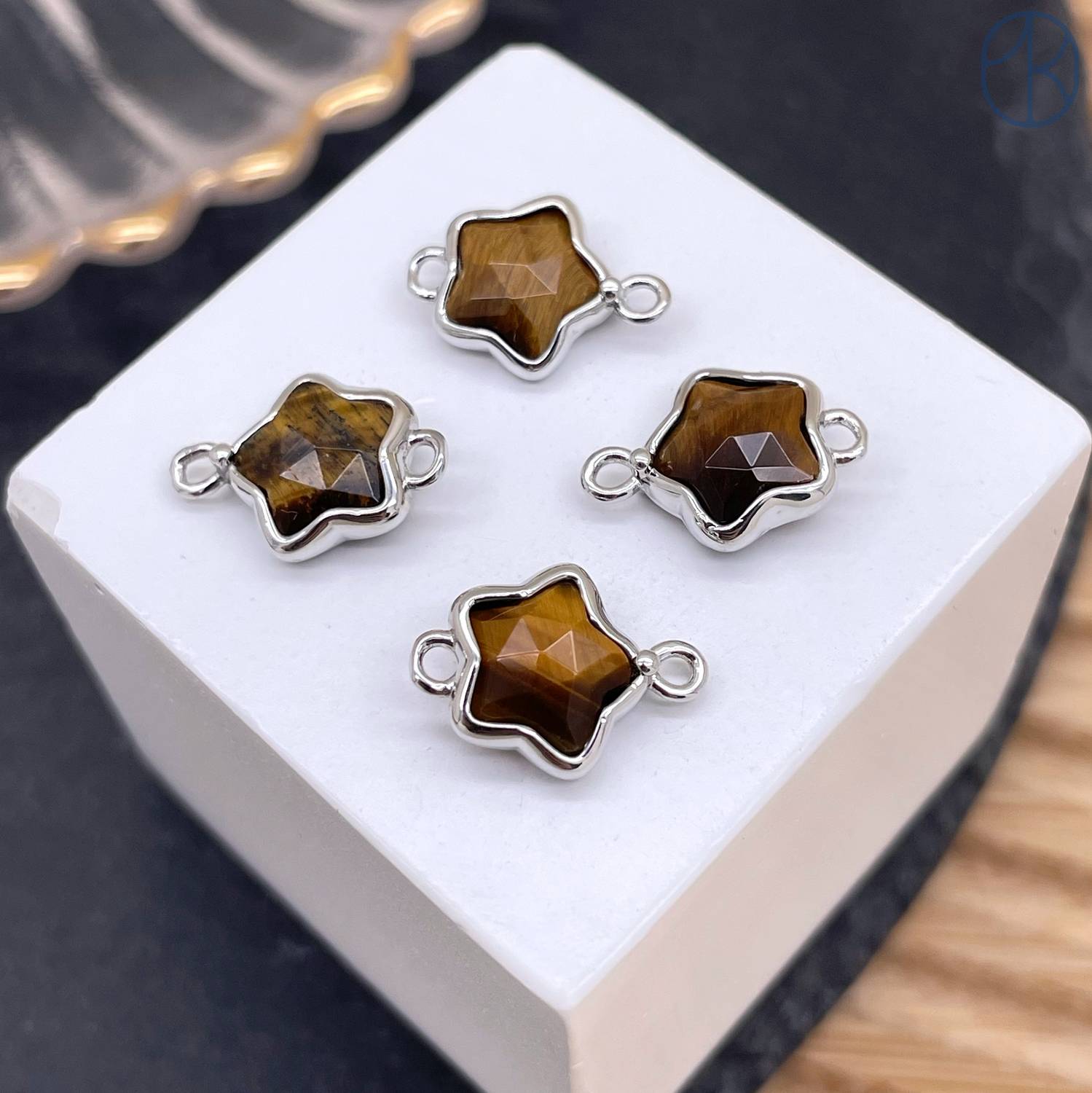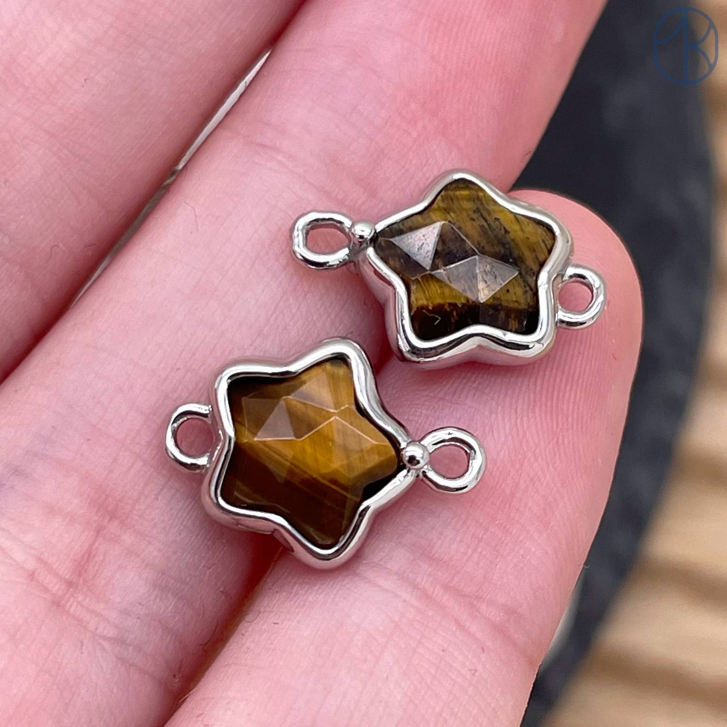 Коннектор звезда огранка тигровый глаз, цвет серебро ~ 12 мм