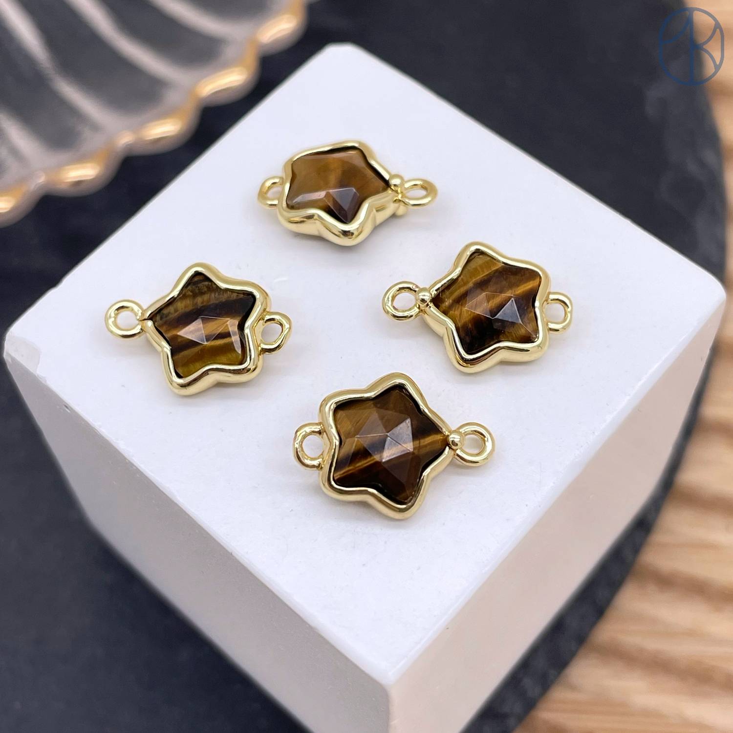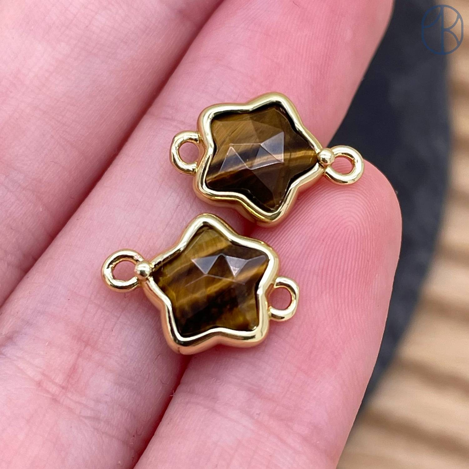 Коннектор звезда огранка тигровый глаз, цвет золото ~ 12 мм