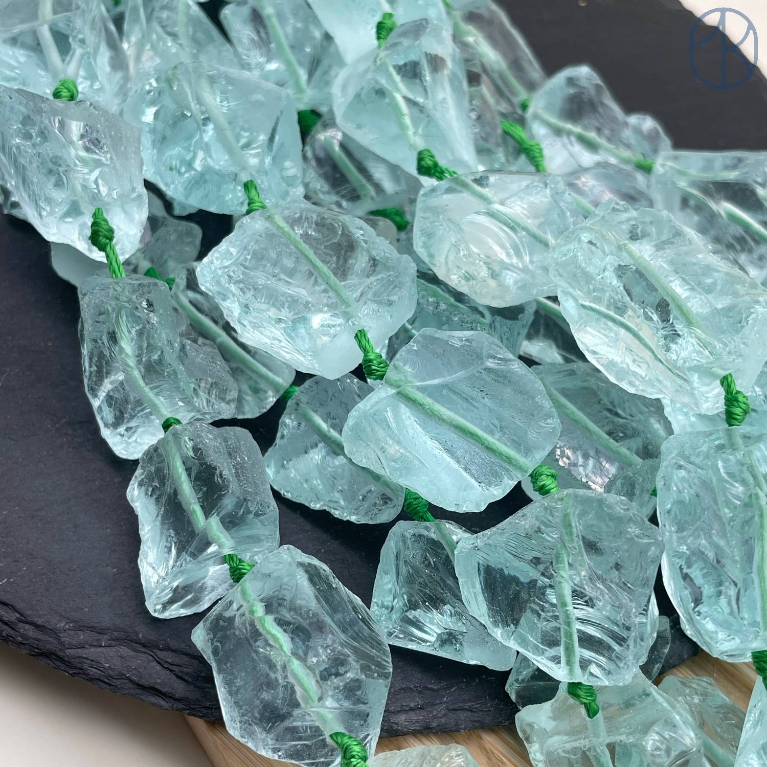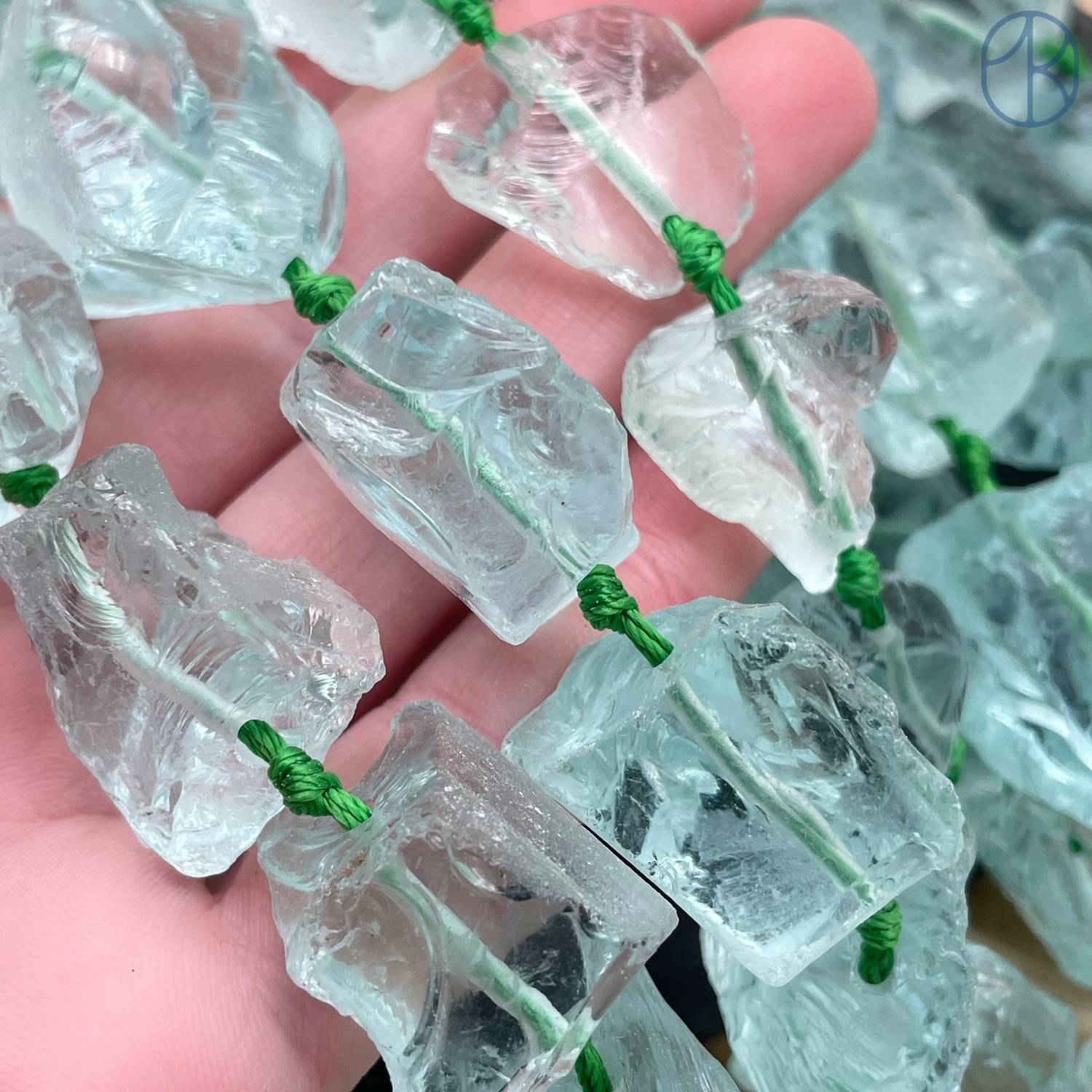 Аквакварц является коммерческим названием таких бусин. Для их изготовления используется тонированное стекло.