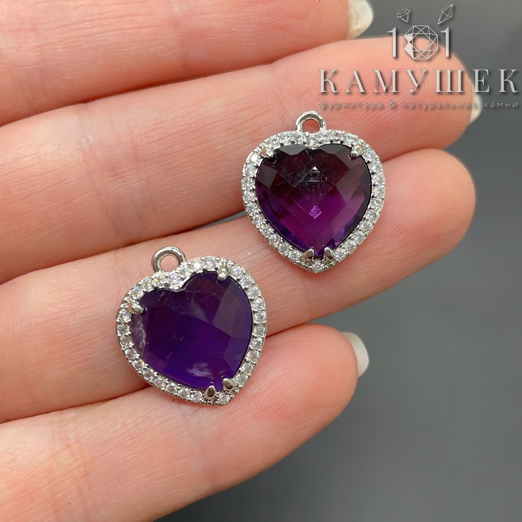 Подвеска сердце огранка цирконы аметист, цвет серебро 16х18 мм