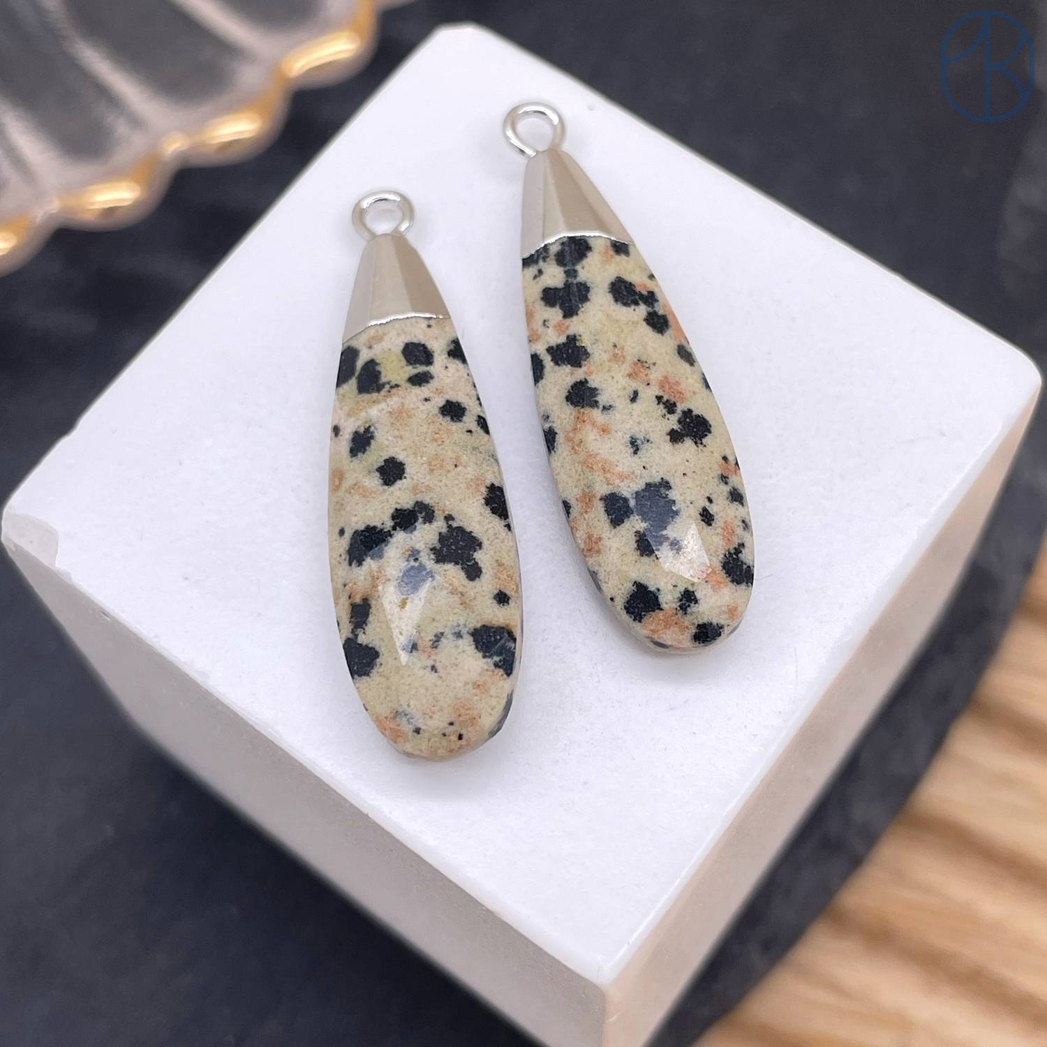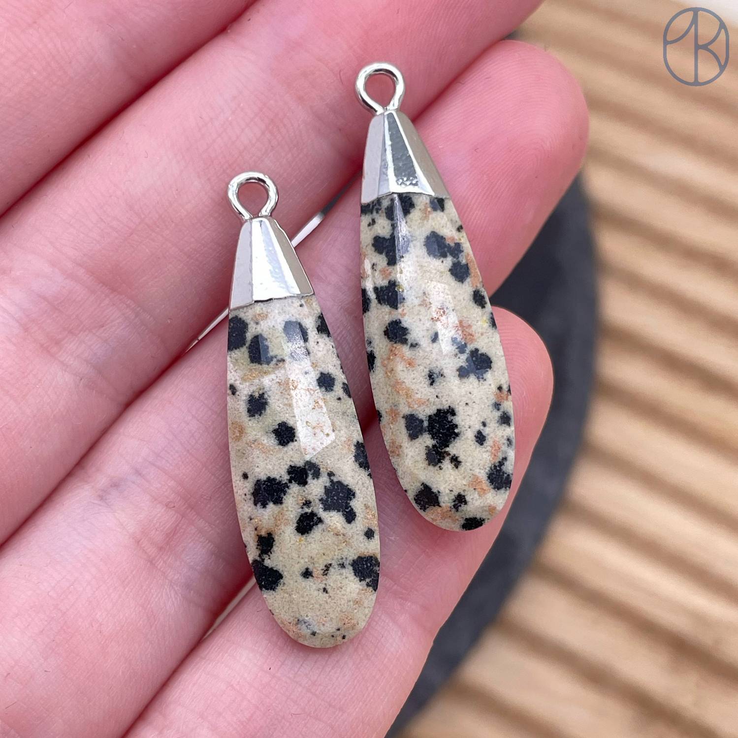 Подвеска капля огранка яшма далматиновая, цвет серебро 30х9 мм