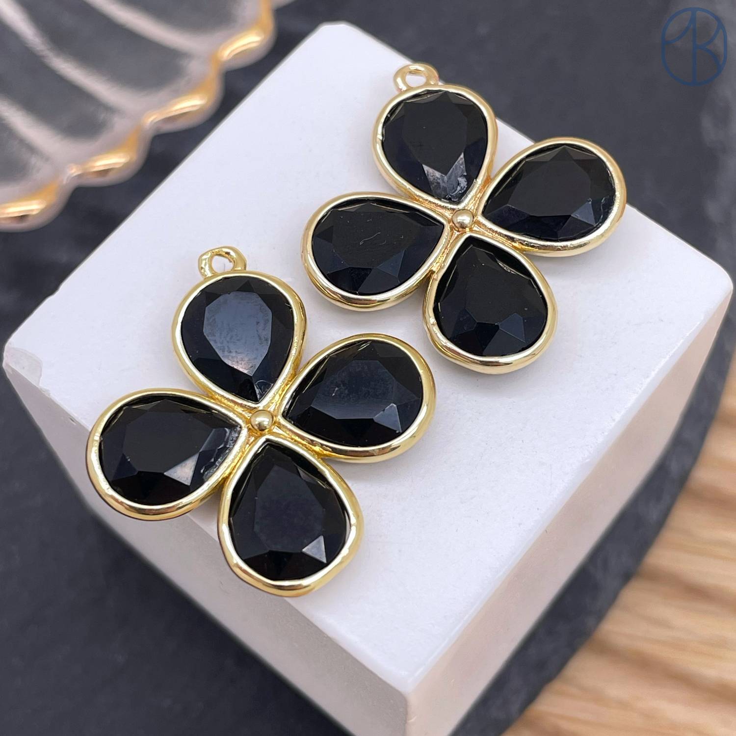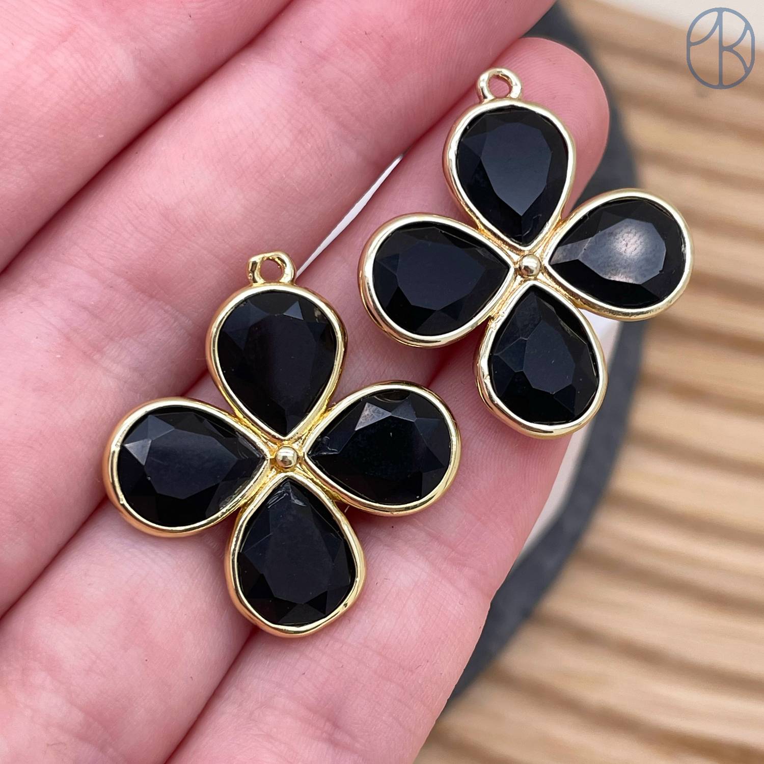 Подвеска клевер огранка черный агат, цвет золото 25 мм