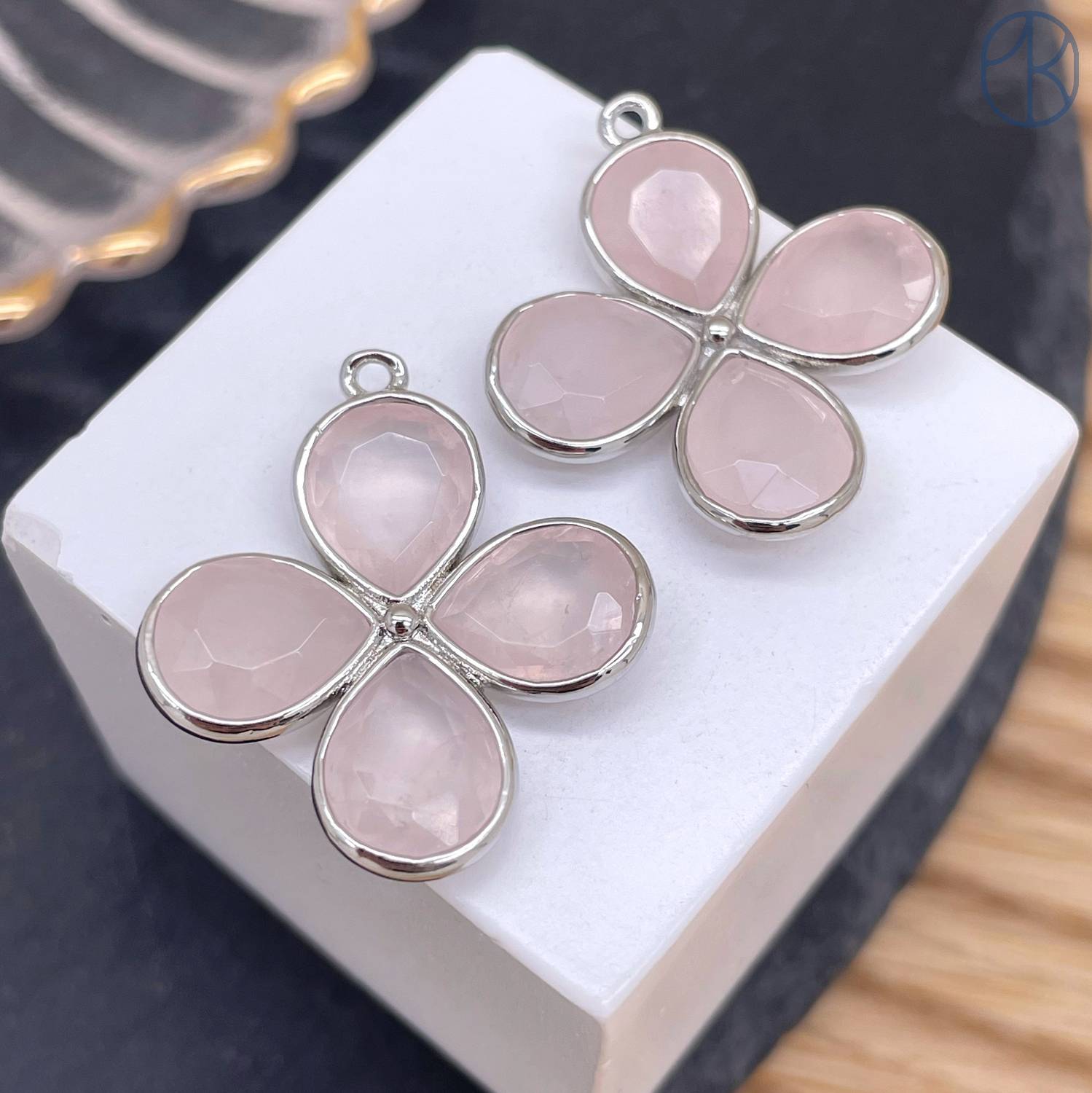 Подвеска клевер огранка розовый кварц, цвет серебро 25 мм