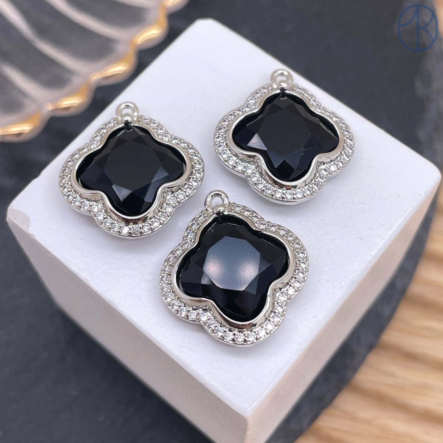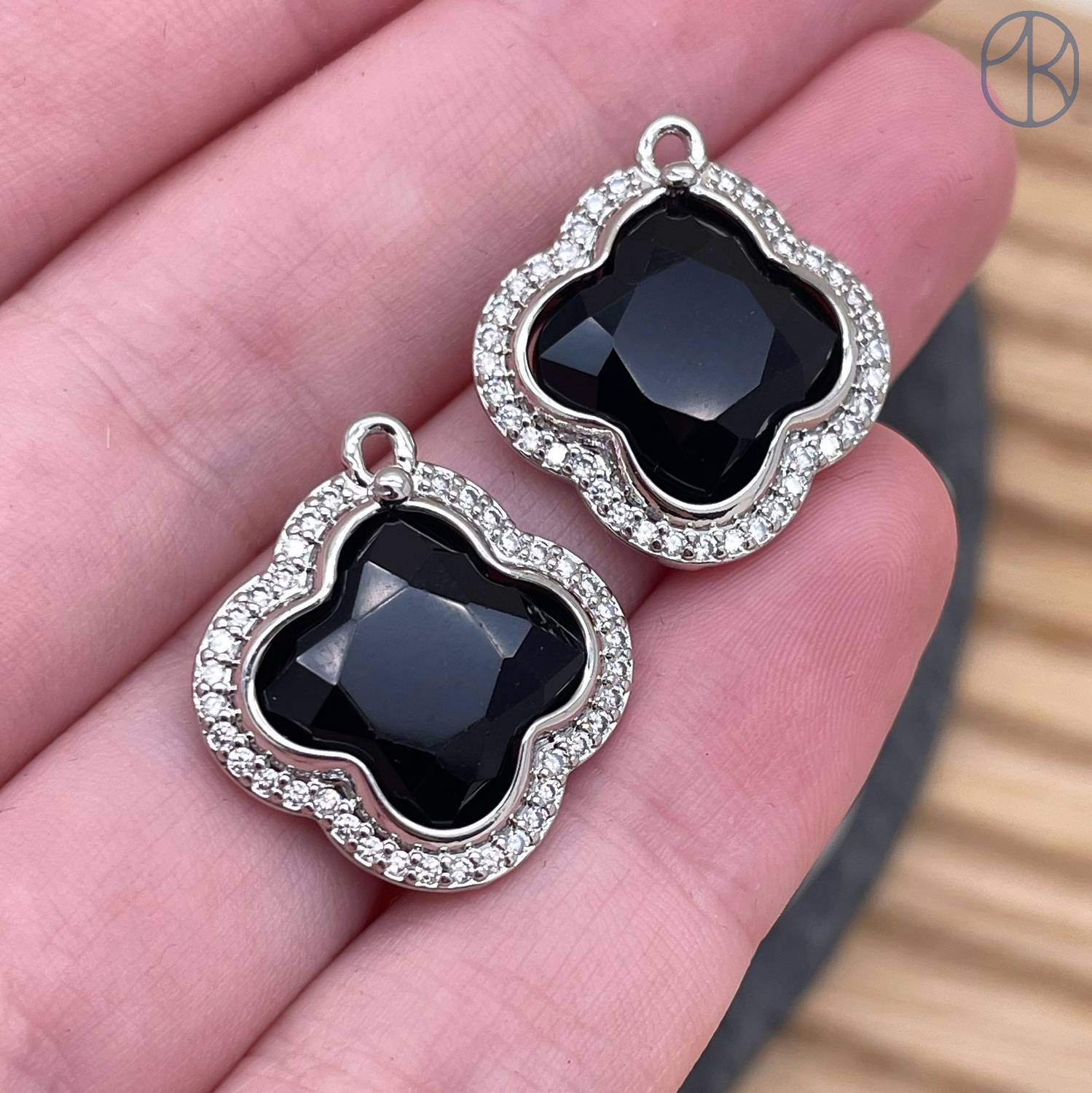 Подвеска клевер огранка цирконы агат черный, цвет серебро 18 мм