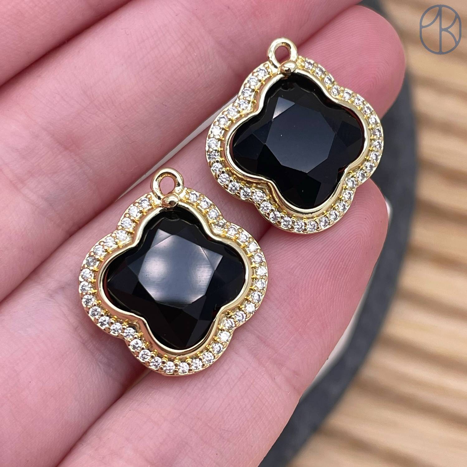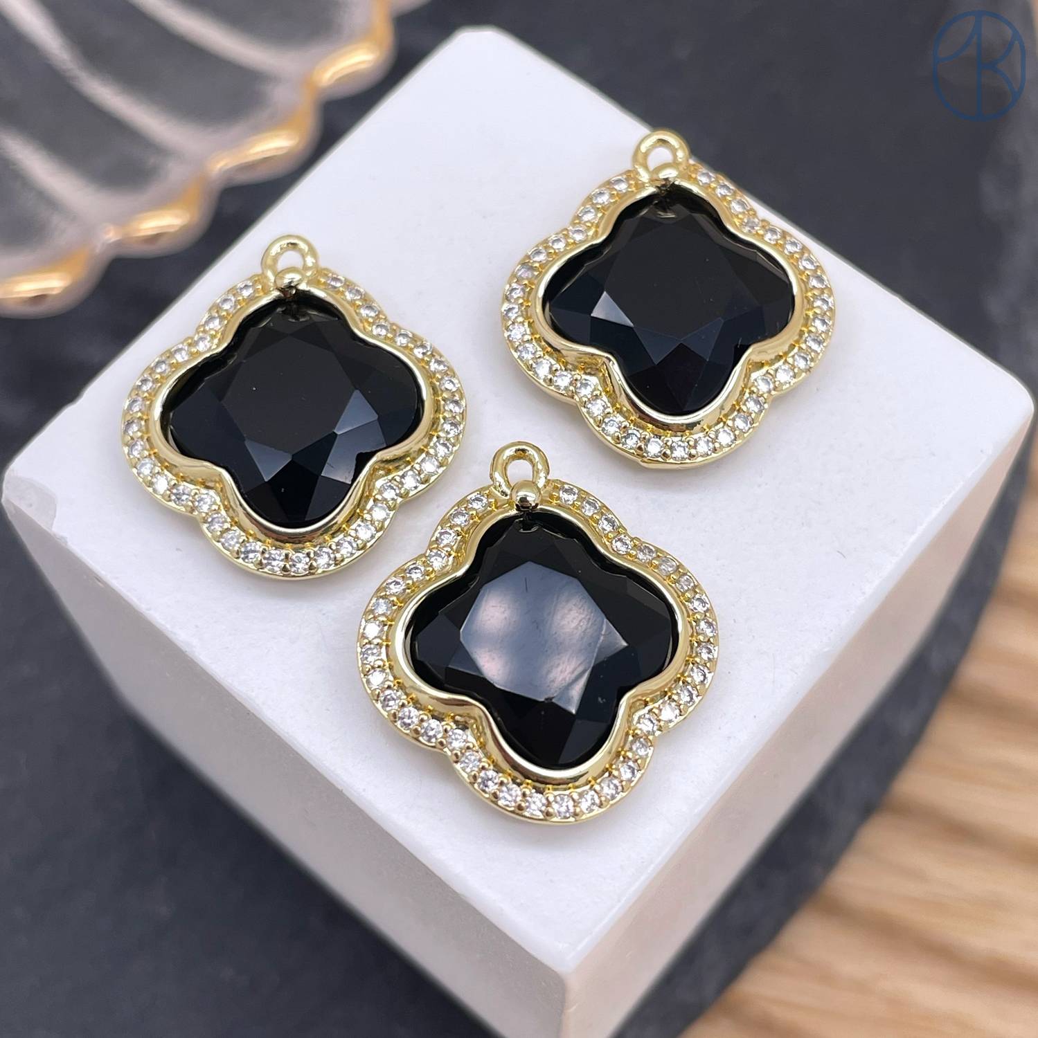 Подвеска клевер огранка цирконы агат черный, цвет золото 18 мм