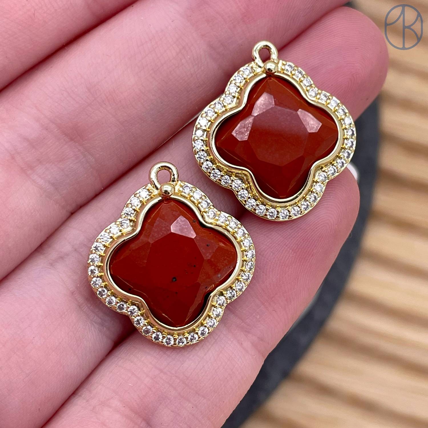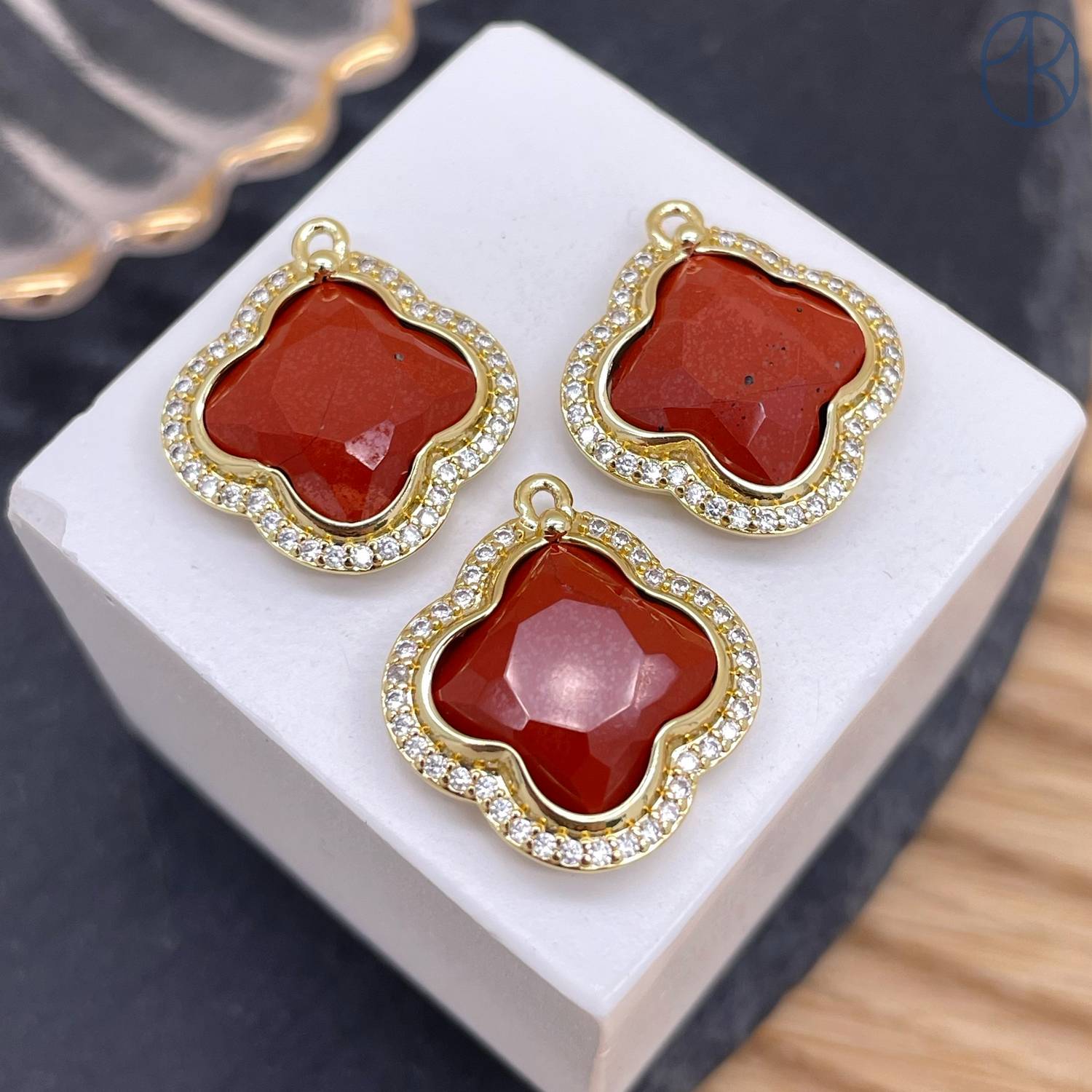 Подвеска клевер огранка цирконы яшма красная, цвет золото 18 мм