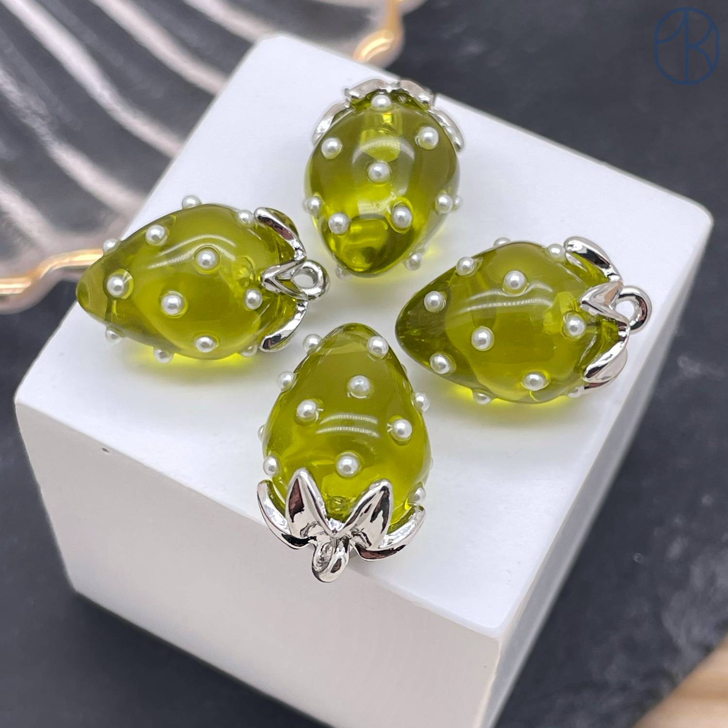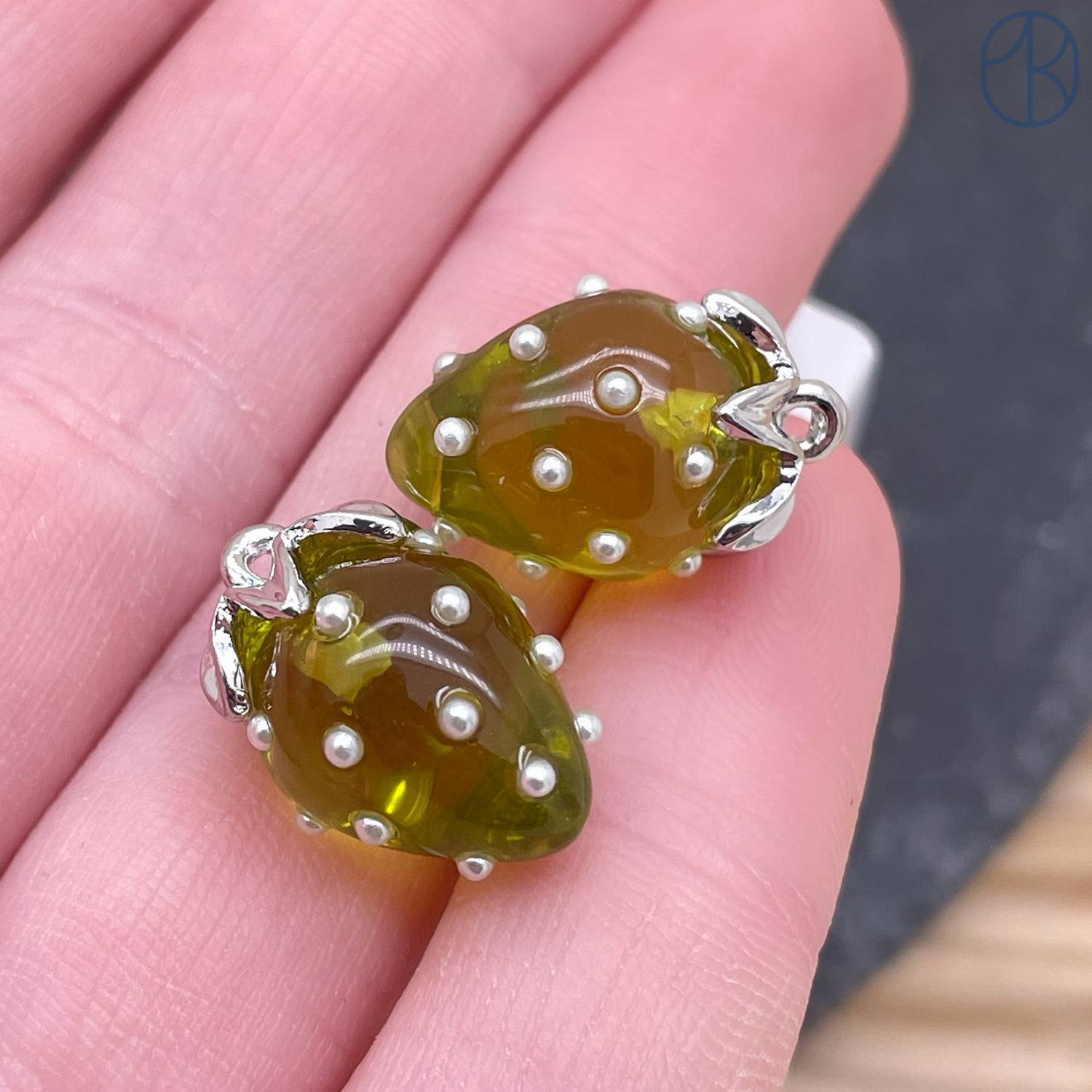 Подвеска клубника прозрачная темно-зеленая, цвет серебро 17х12 мм