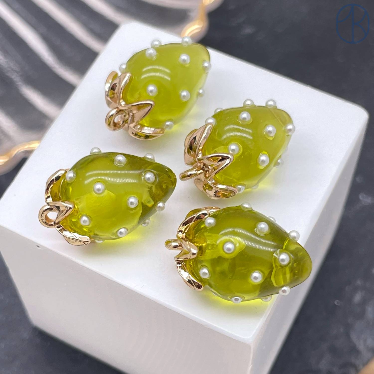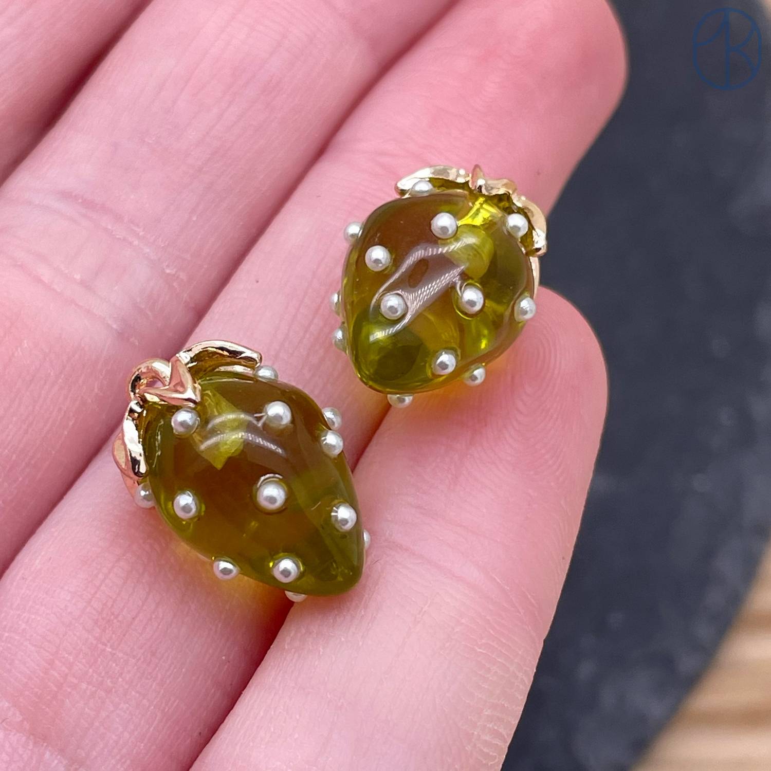 Подвеска клубника прозрачная темно-зеленая, цвет золото 17х12 мм
