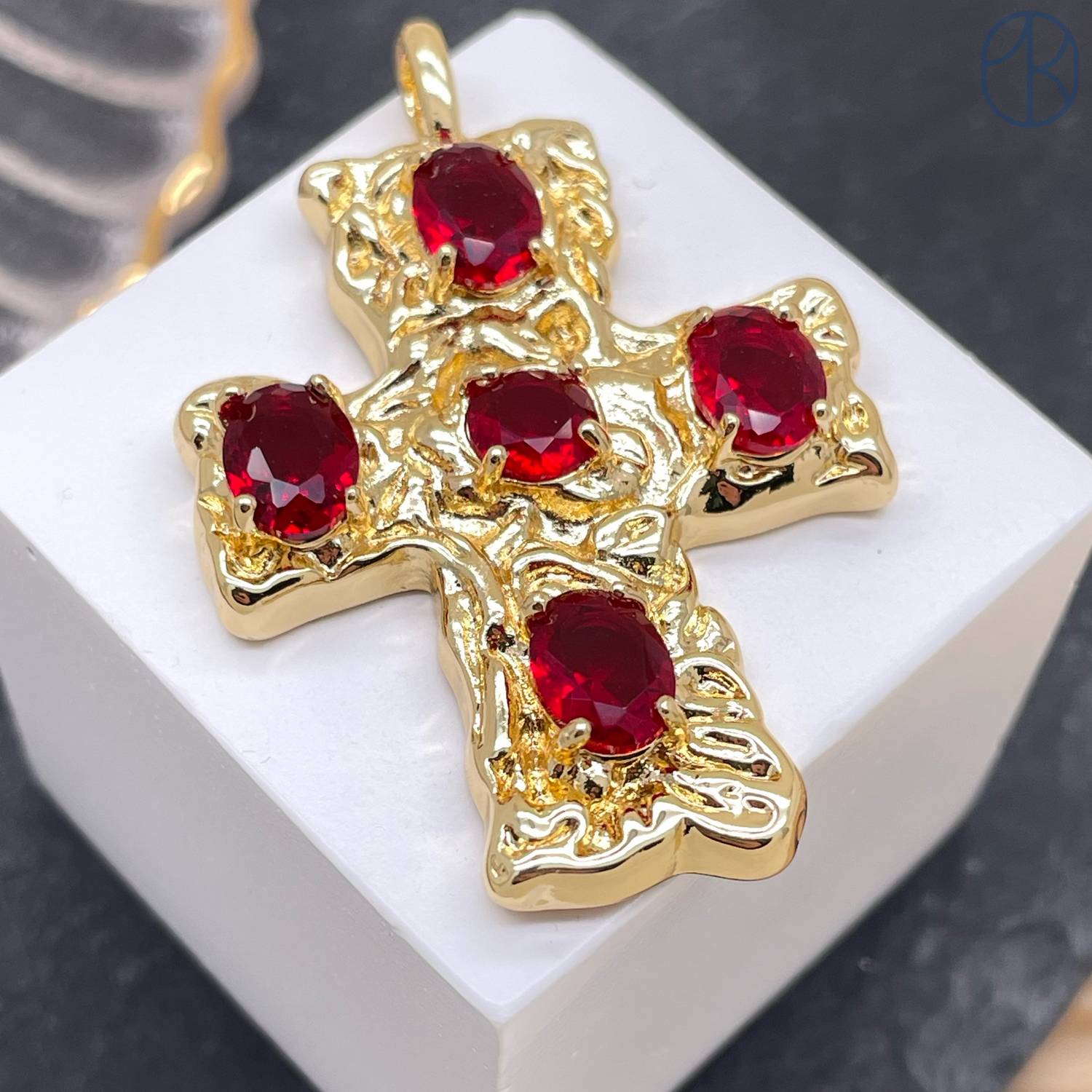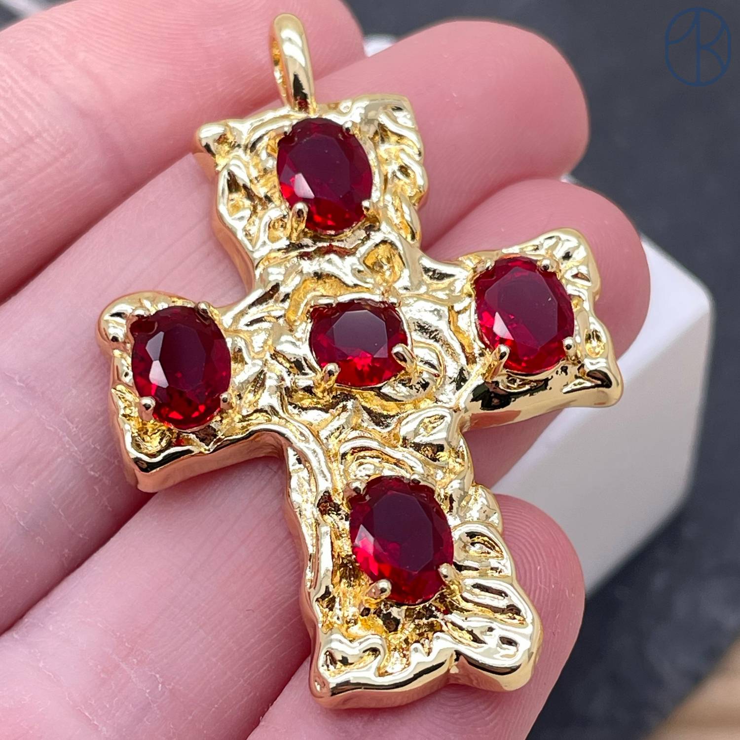 Подвеска крест красные цирконы, цвет золото 40 мм