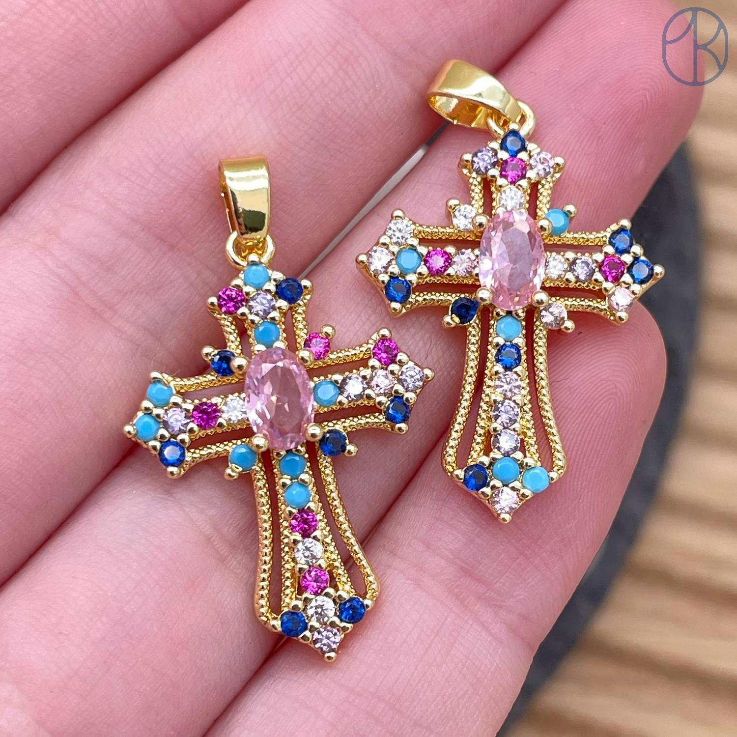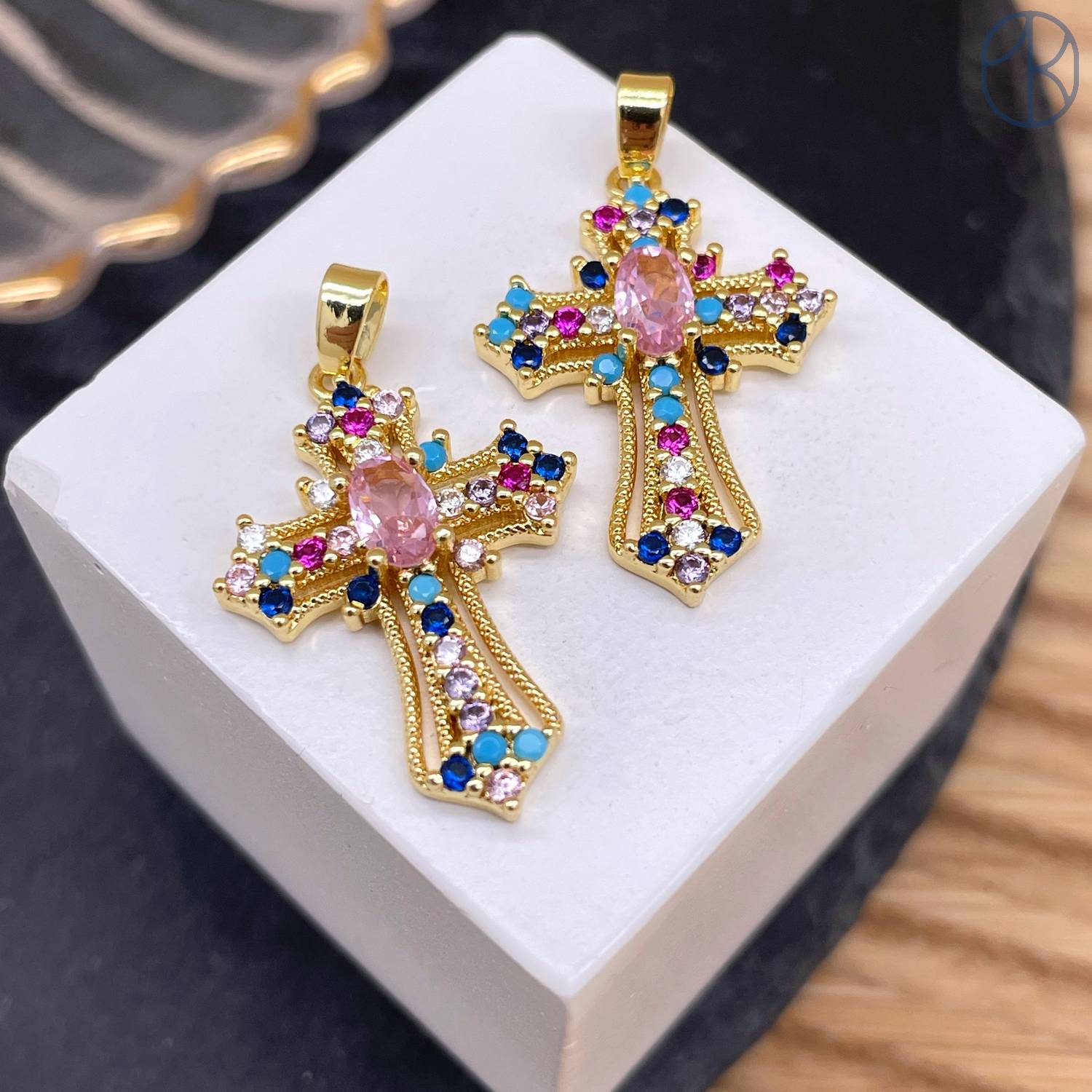 Подвеска крест микс цирконы, цвет золото 25 мм