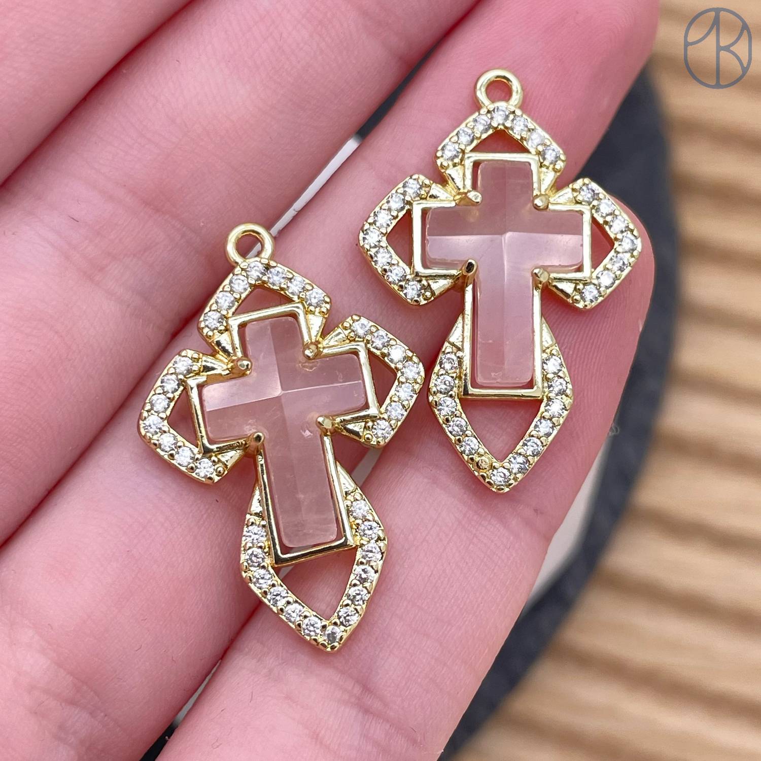 Подвеска крест цирконы розовый кварц, цвет золото 24 мм