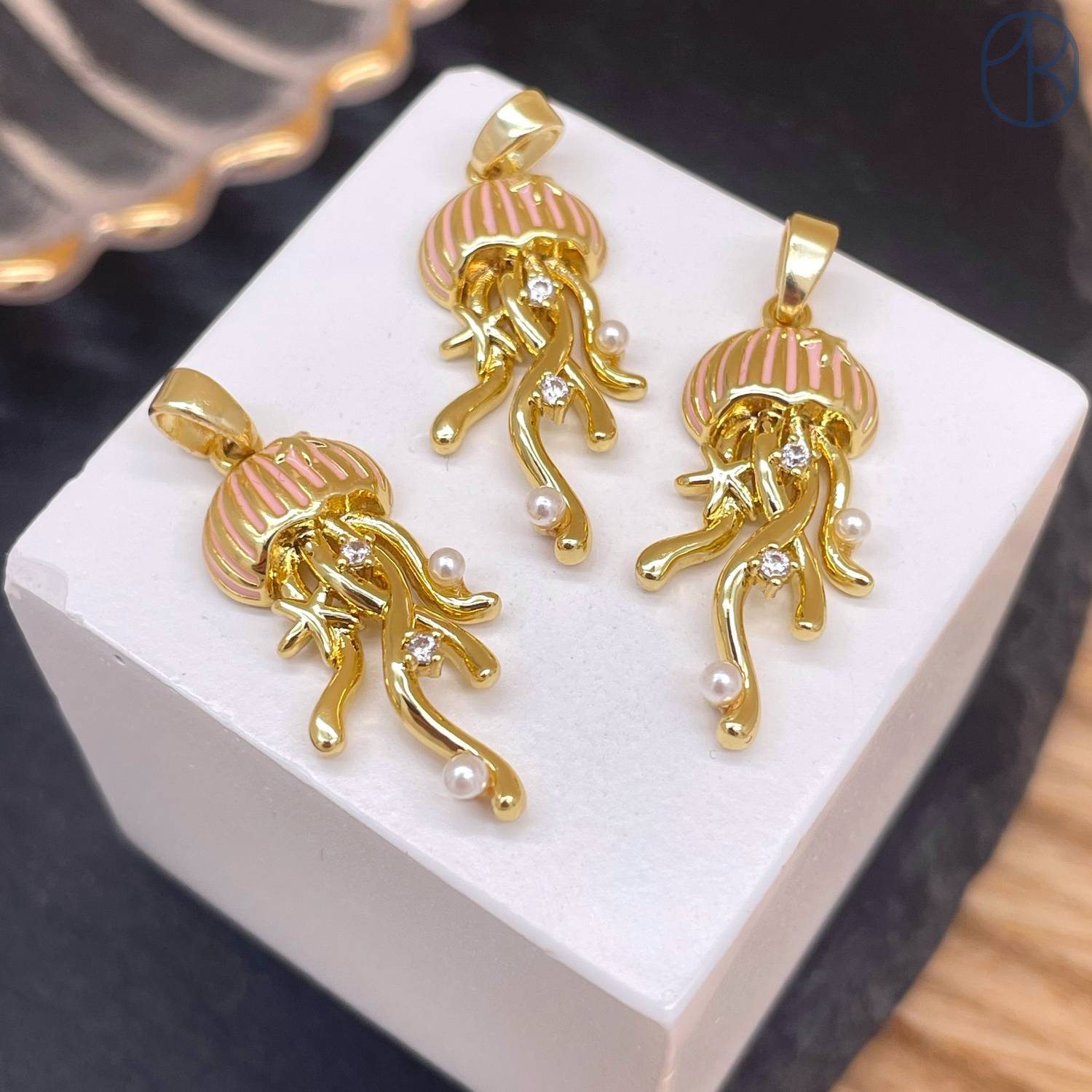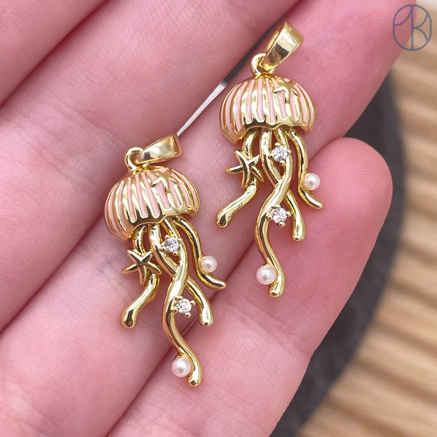 Подвеска медуза розовая эмаль, цвет золото 22 мм