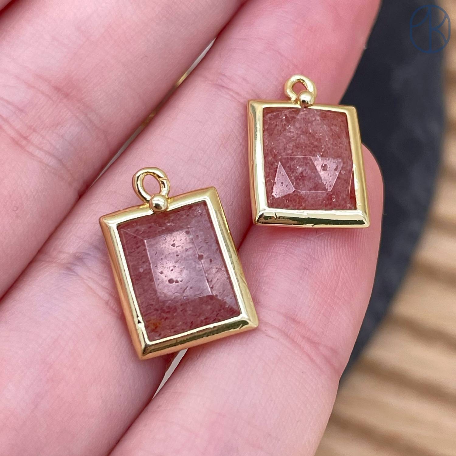 Подвеска прямоугольник огранка кварц клубничный, цвет золото 13х10 мм
