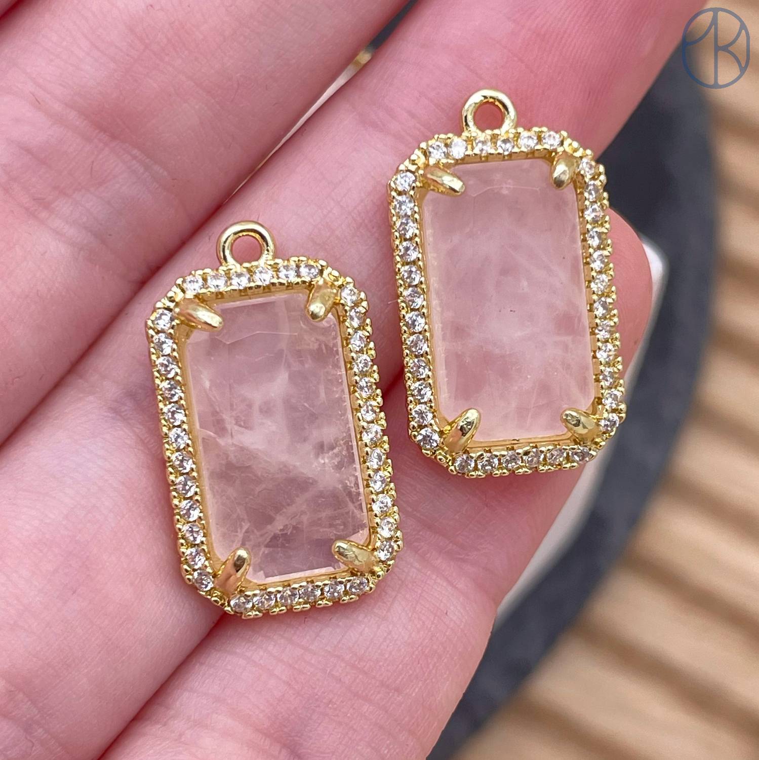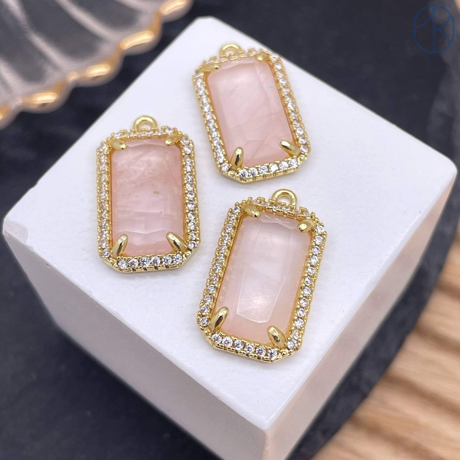 Подвеска прямоугольник цирконы розовый кварц, цвет золото 18х12 мм