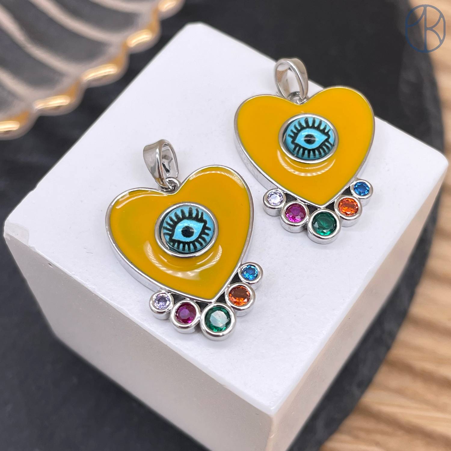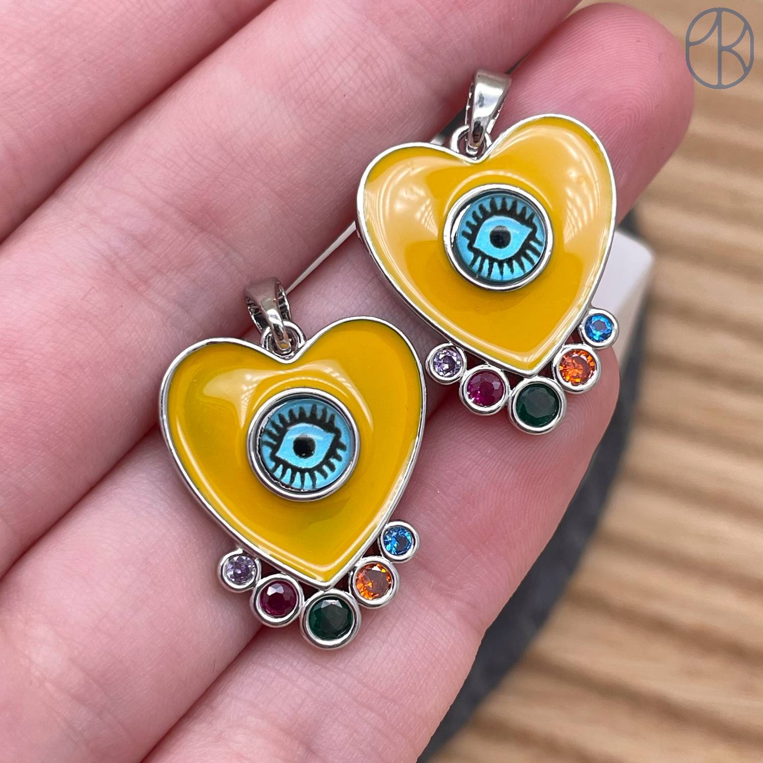 Подвеска сердце глаз цирконы желтая эмаль, цвет серебро 21 мм