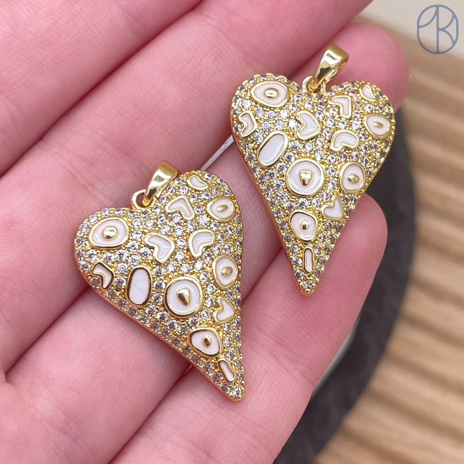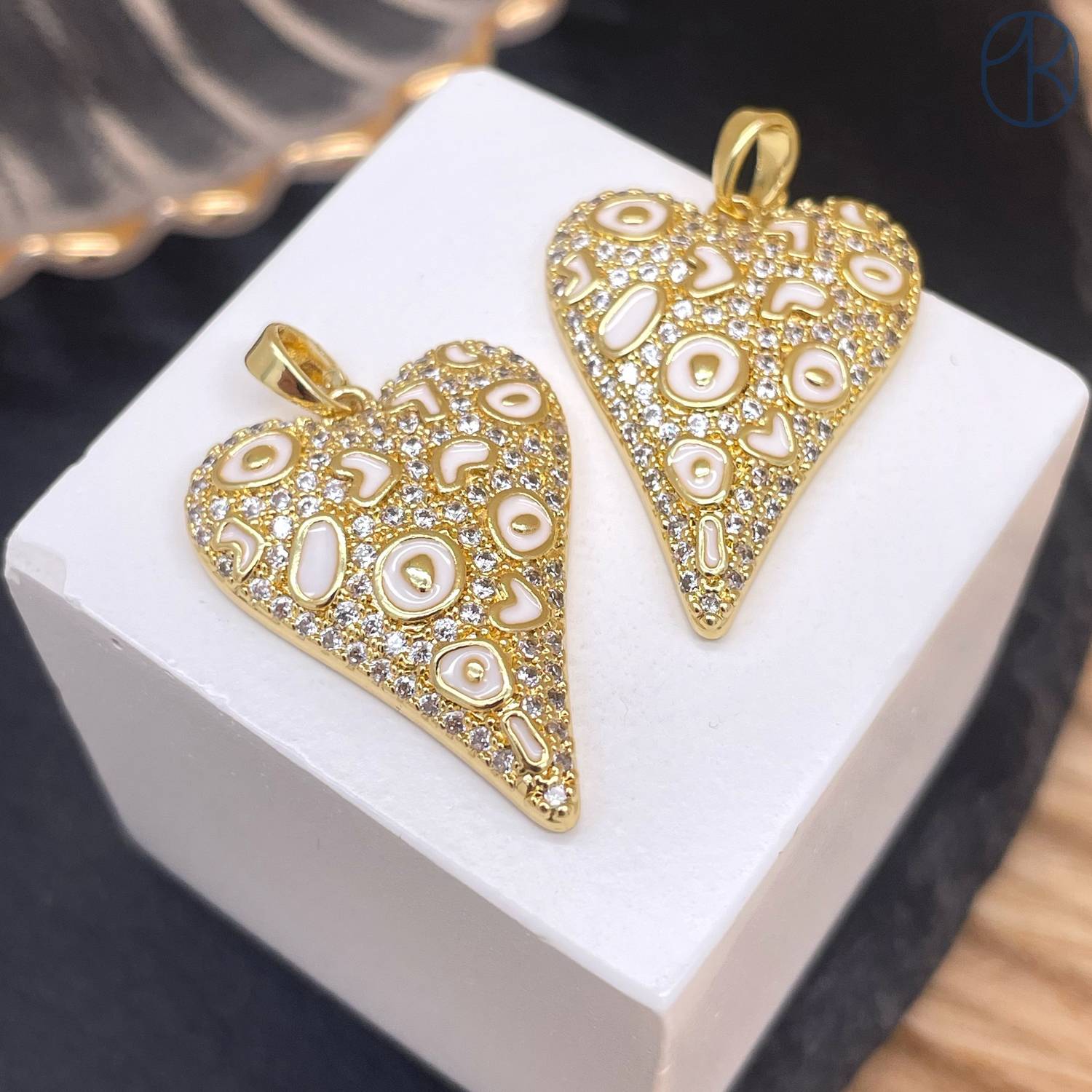 Подвеска сердце цирконы белая эмаль, цвет золото 24 мм