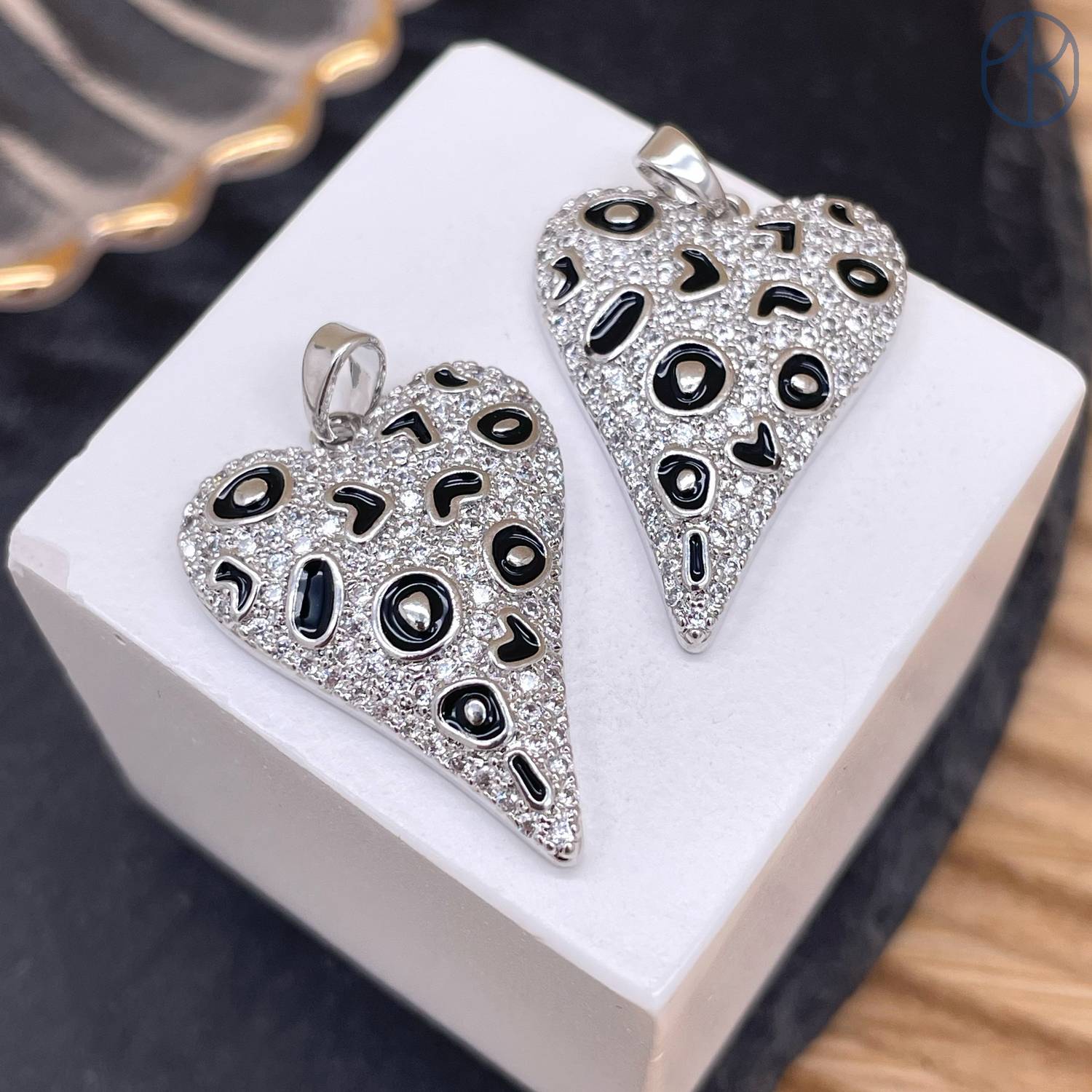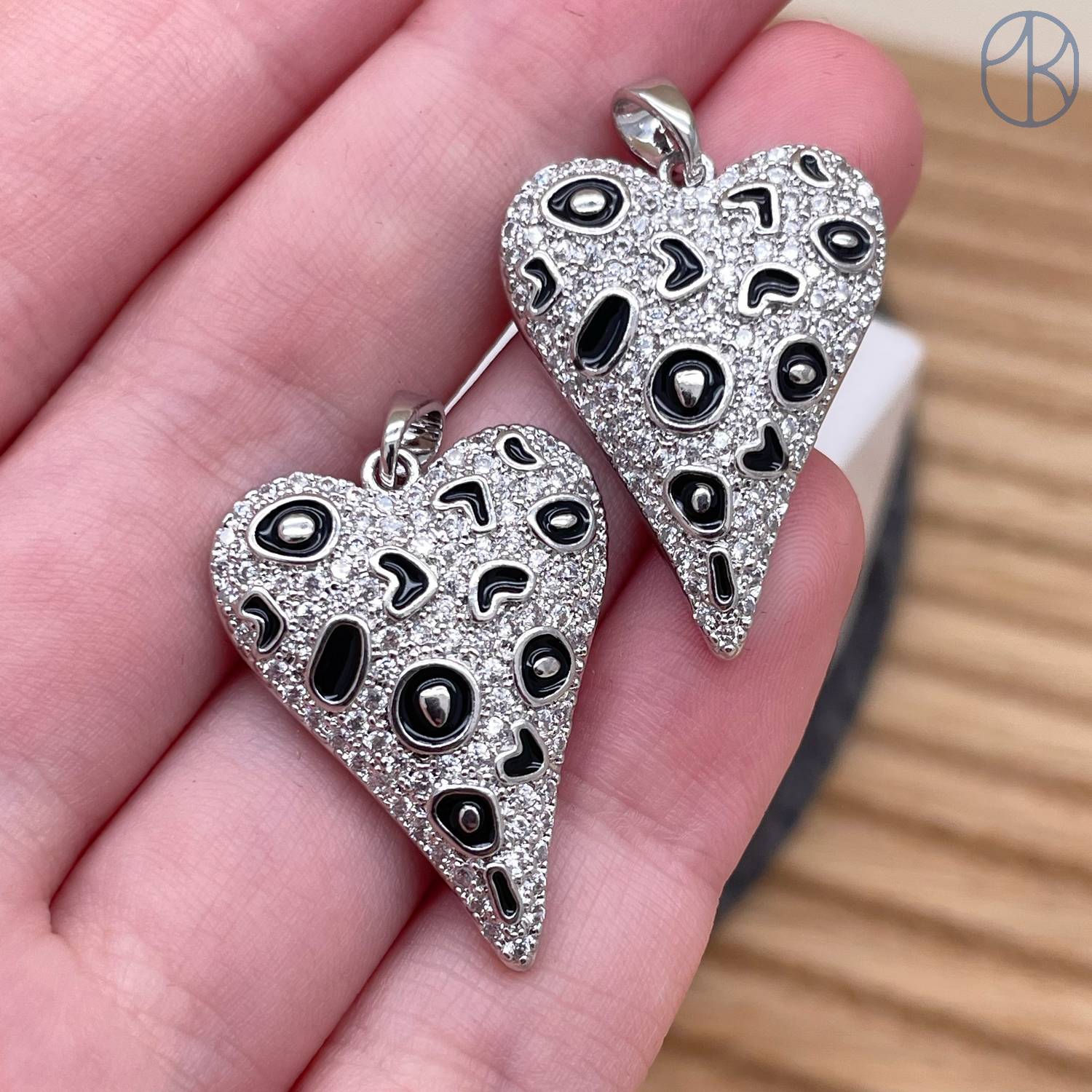 Подвеска сердце цирконы черная эмаль, цвет серебро 24 мм