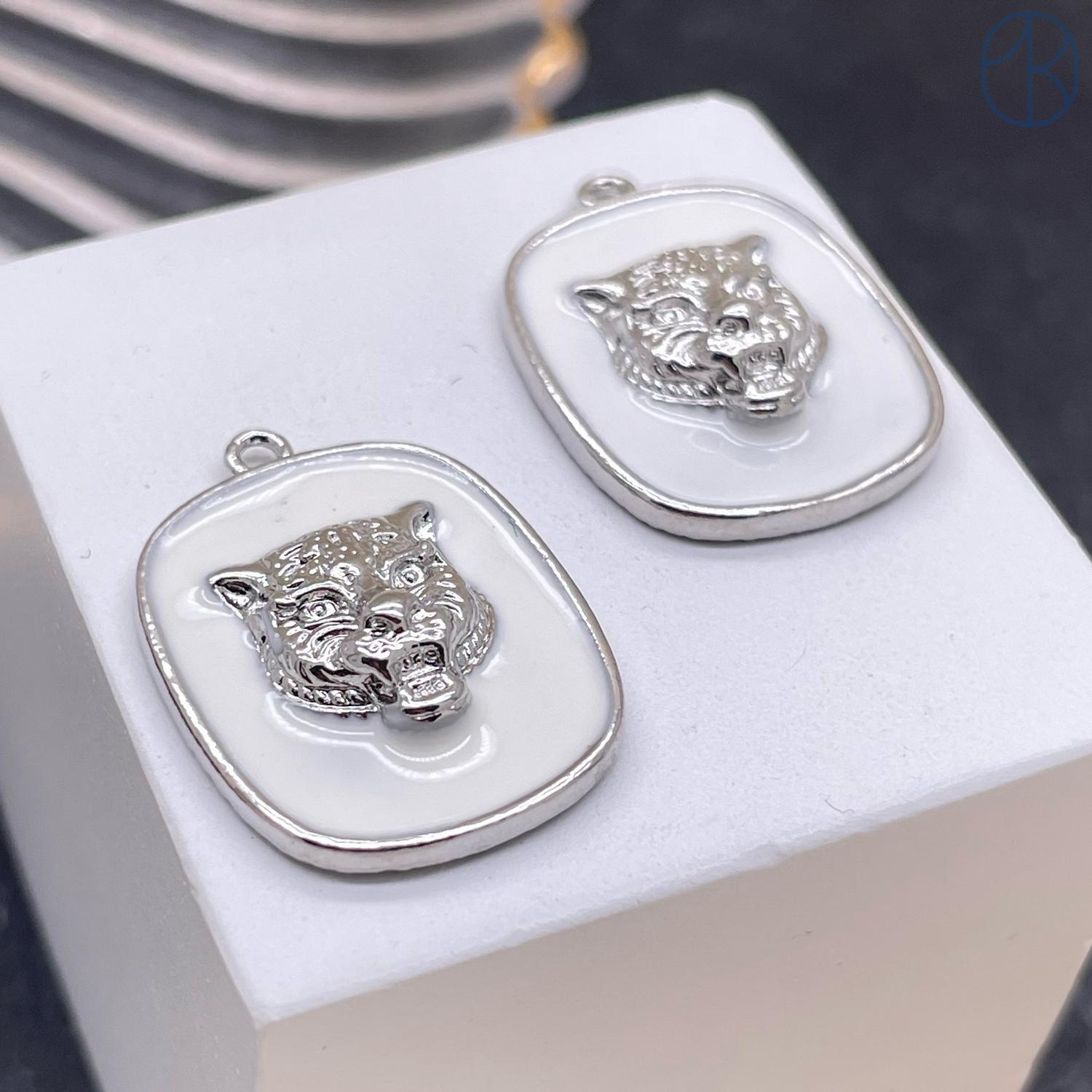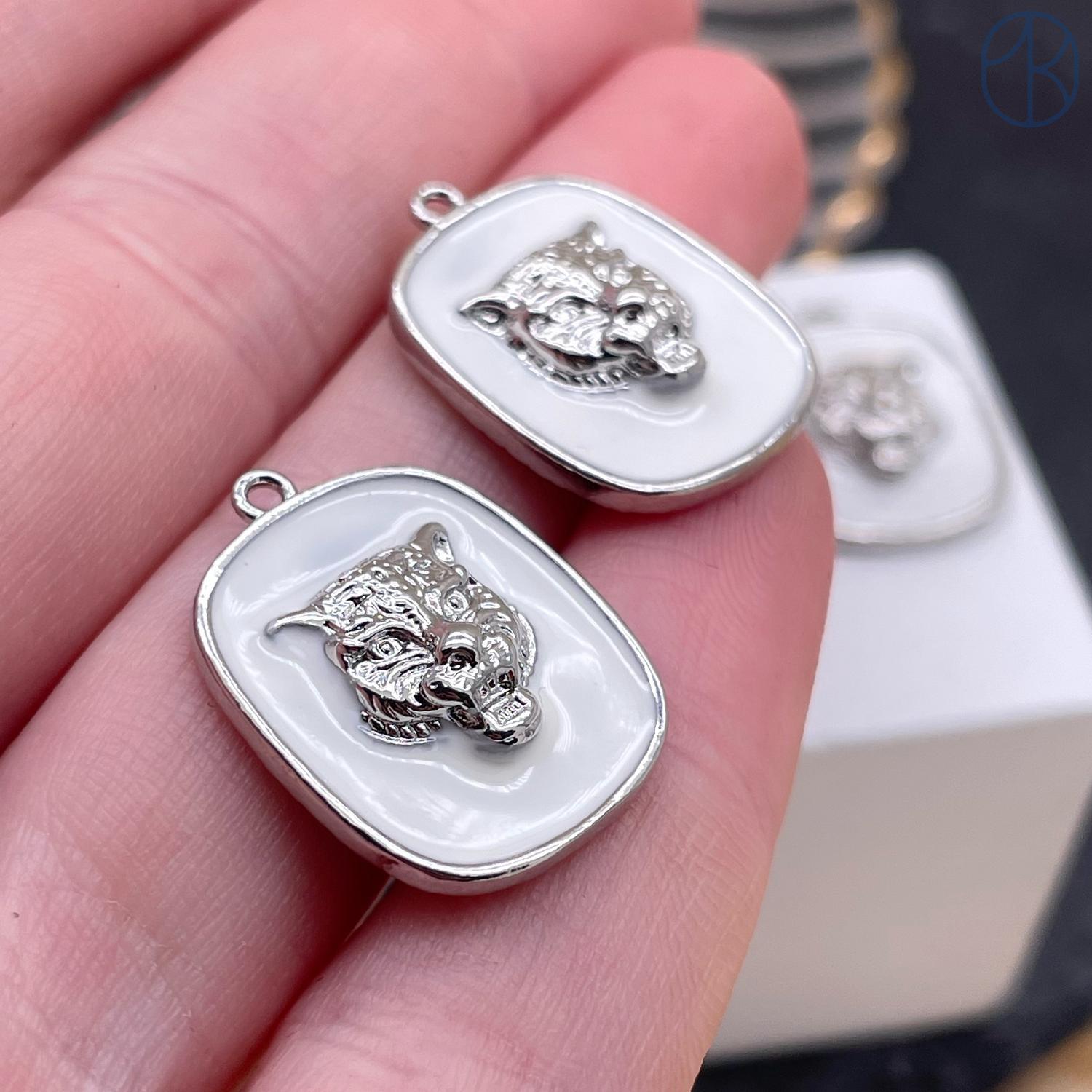 Подвеска тигр квадрат белая эмаль, цвет серебро 22х16 мм