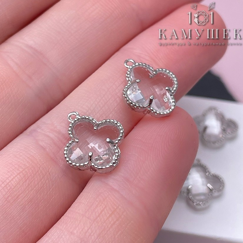 Подвеска клевер белый циркон, цвет серебро 13х11 мм