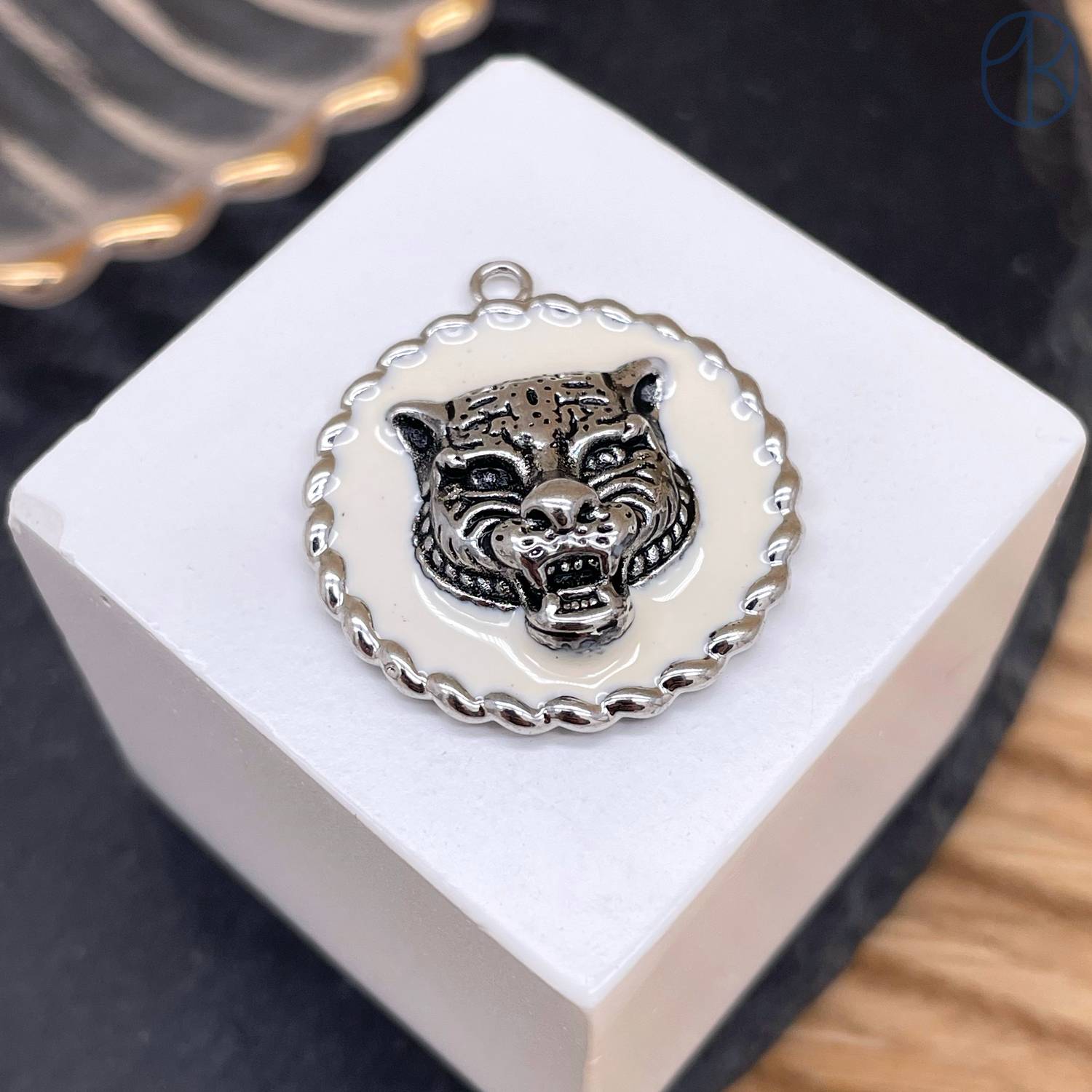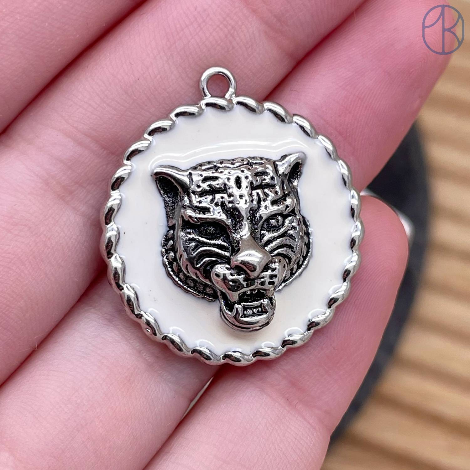 Подвеска тигр белая эмаль, цвет серебро 25 мм