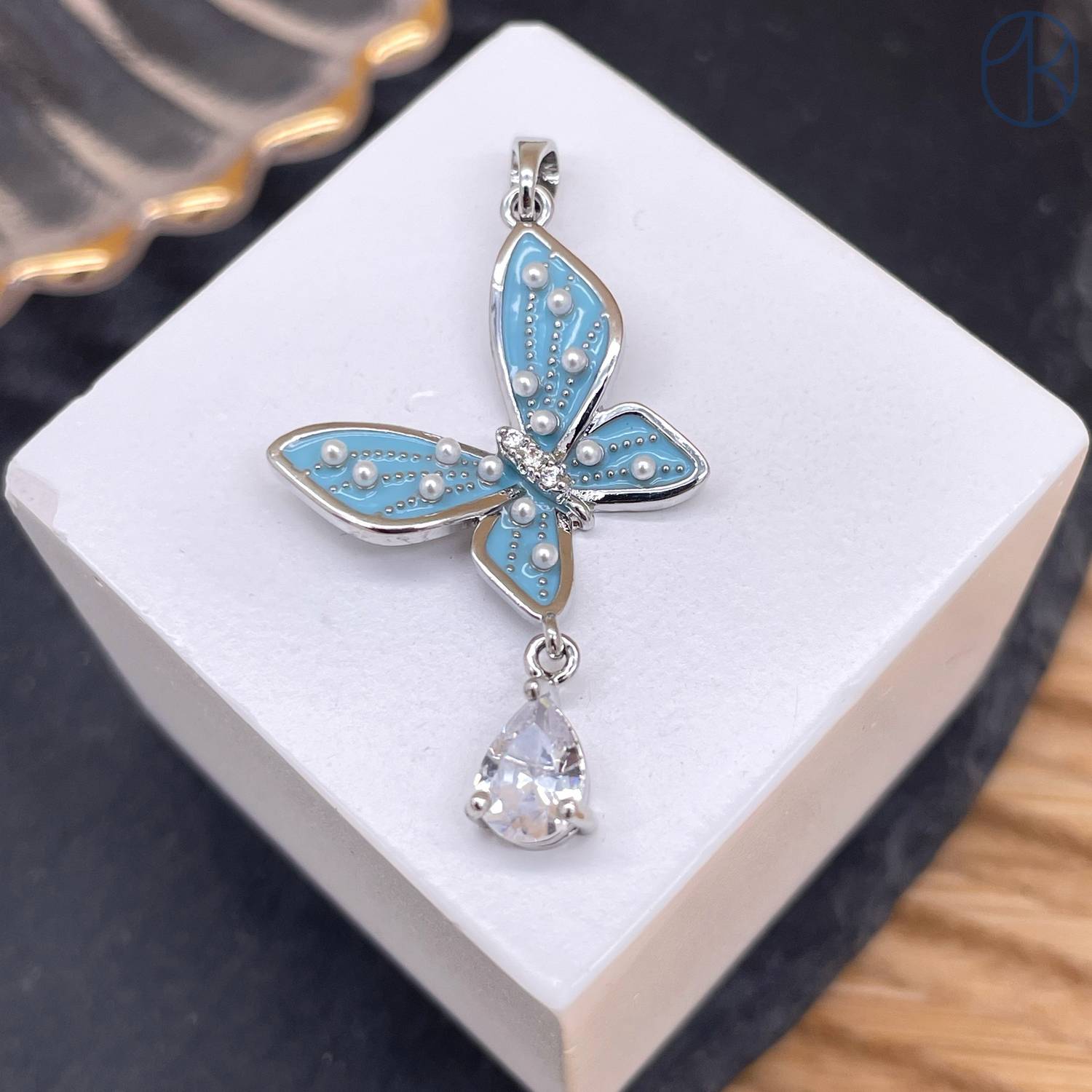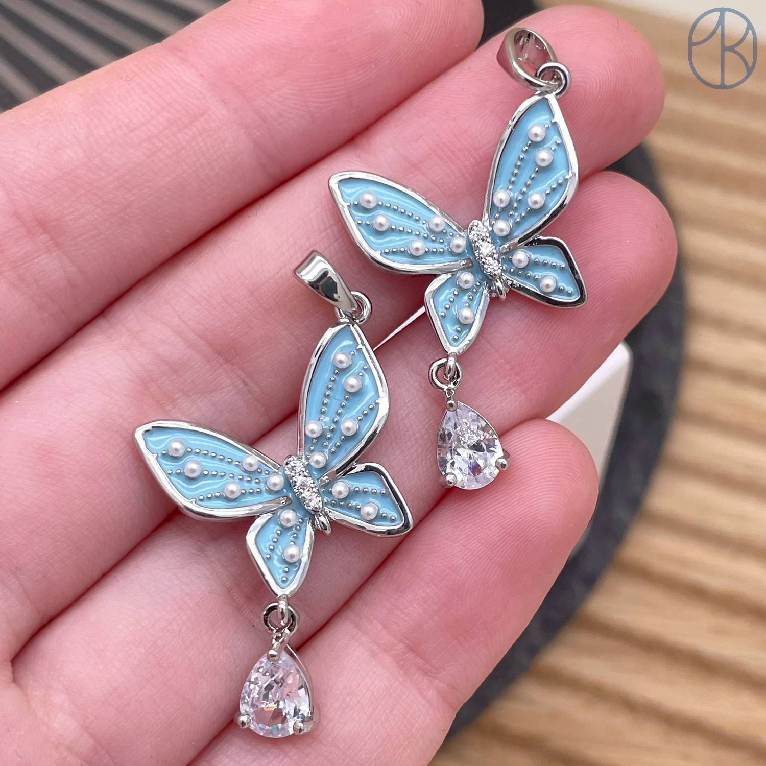 Подвеска бабочка голубая эмаль, цвет серебро 17 мм
