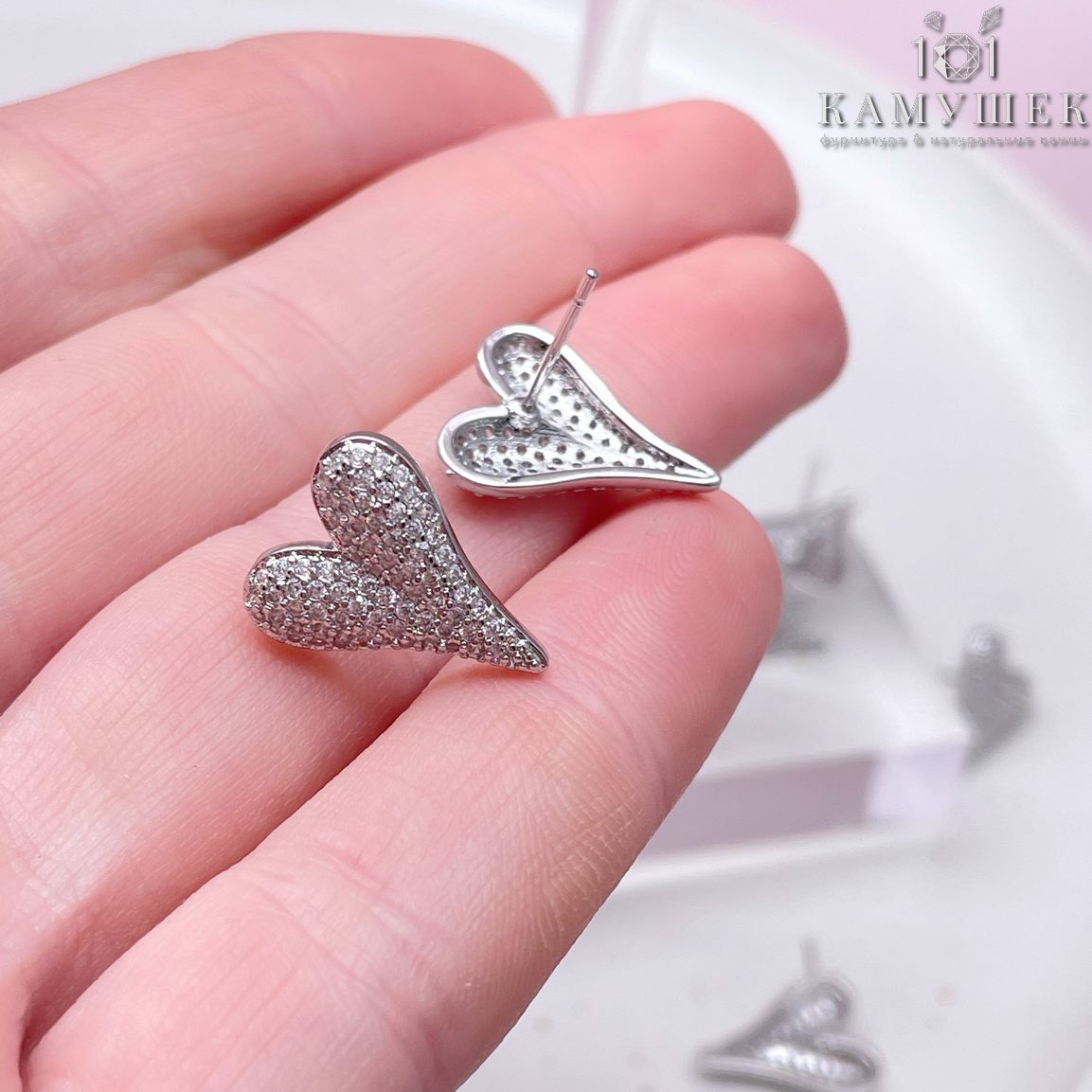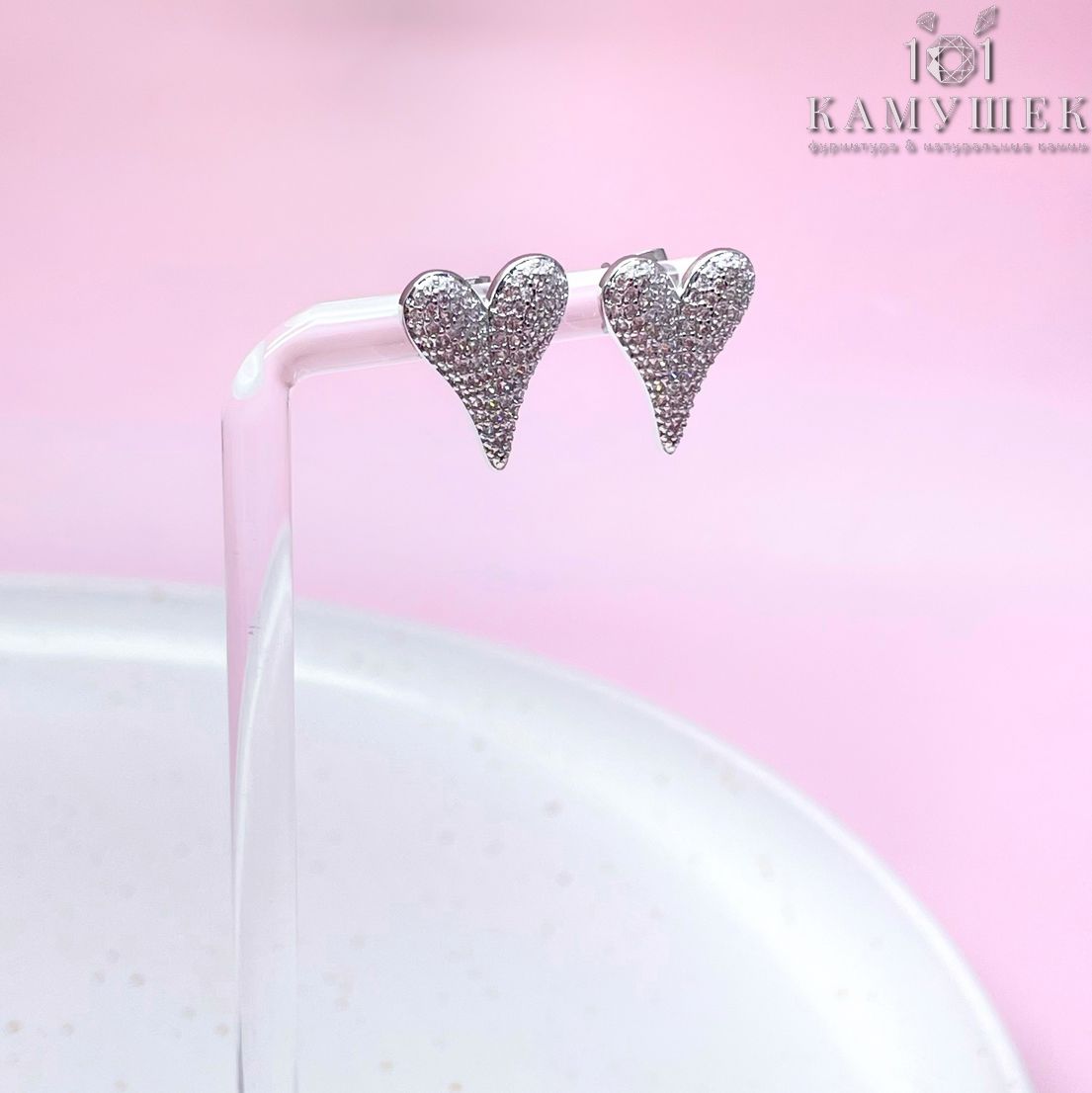 Пусеты сердце цирконы, цвет серебро 13х16 мм
