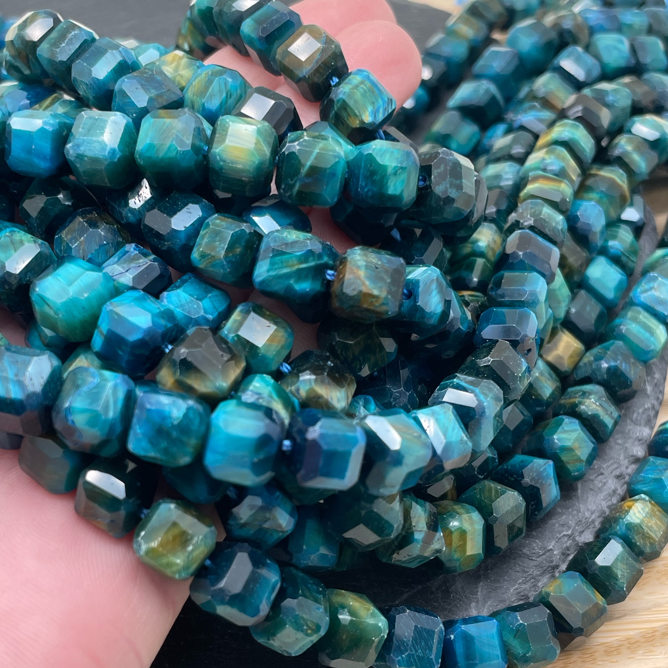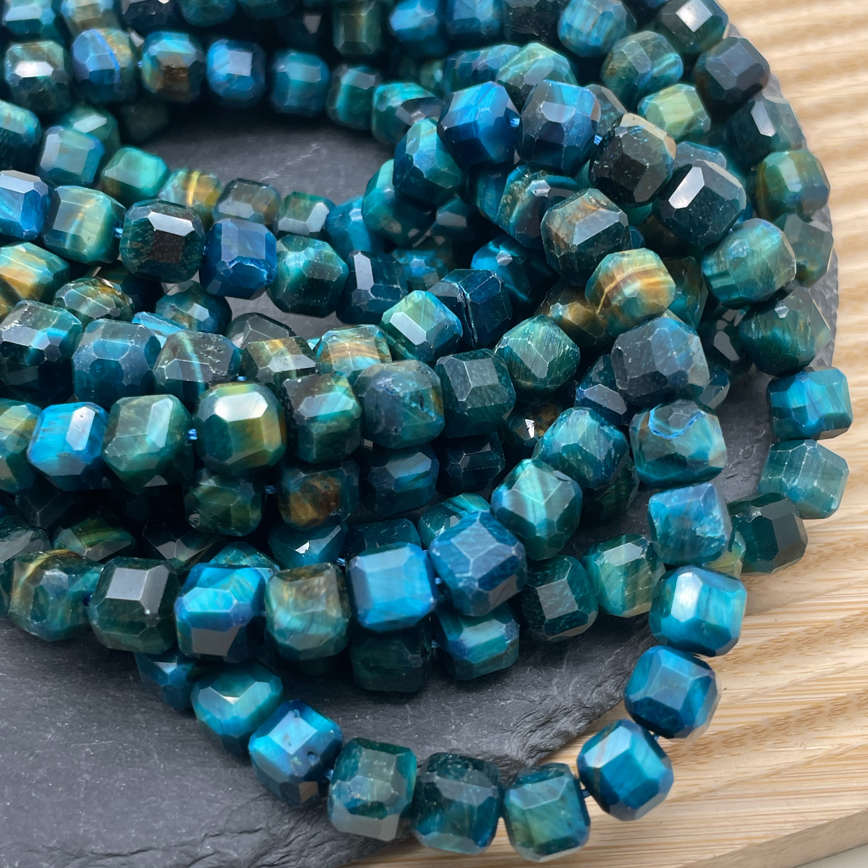 Тигровый глаз тонированный голубой куб огранка 9 мм