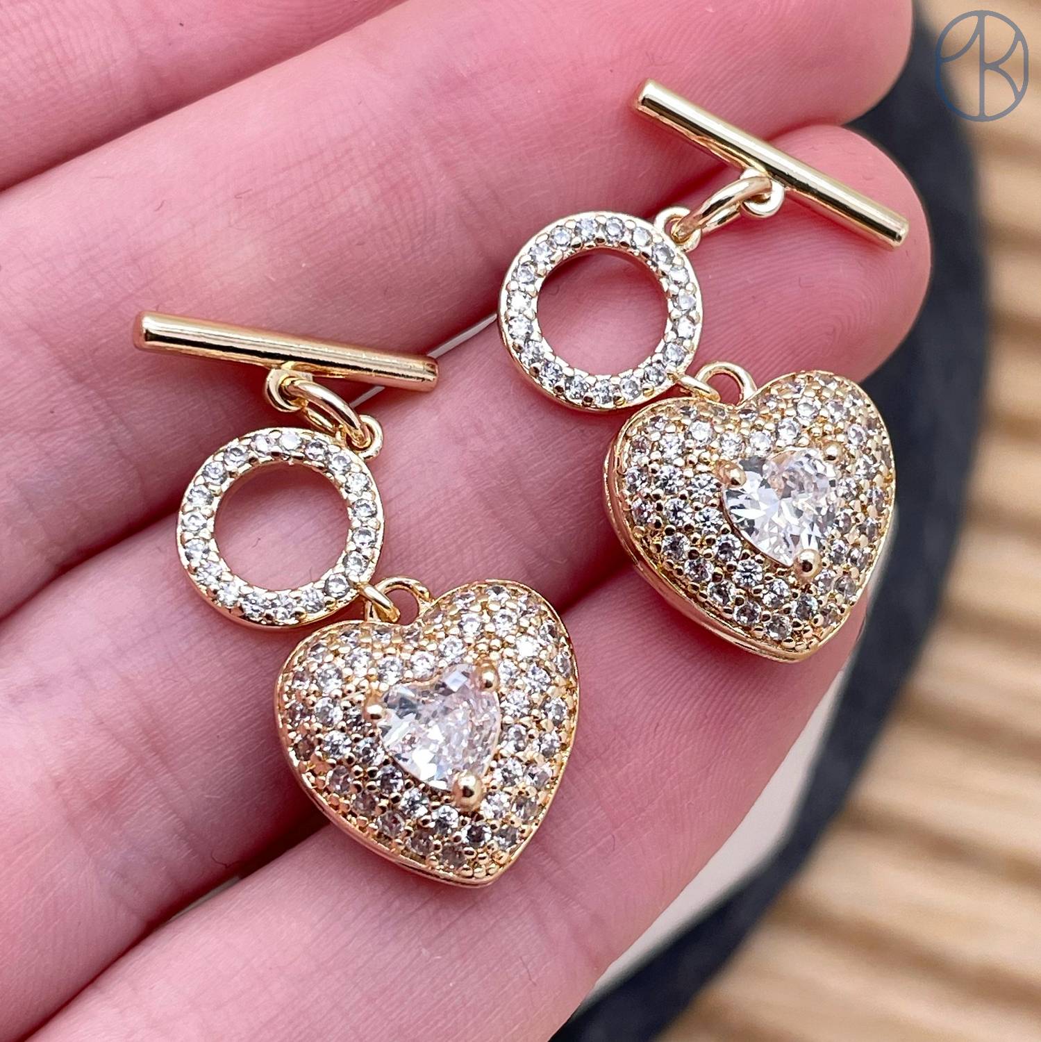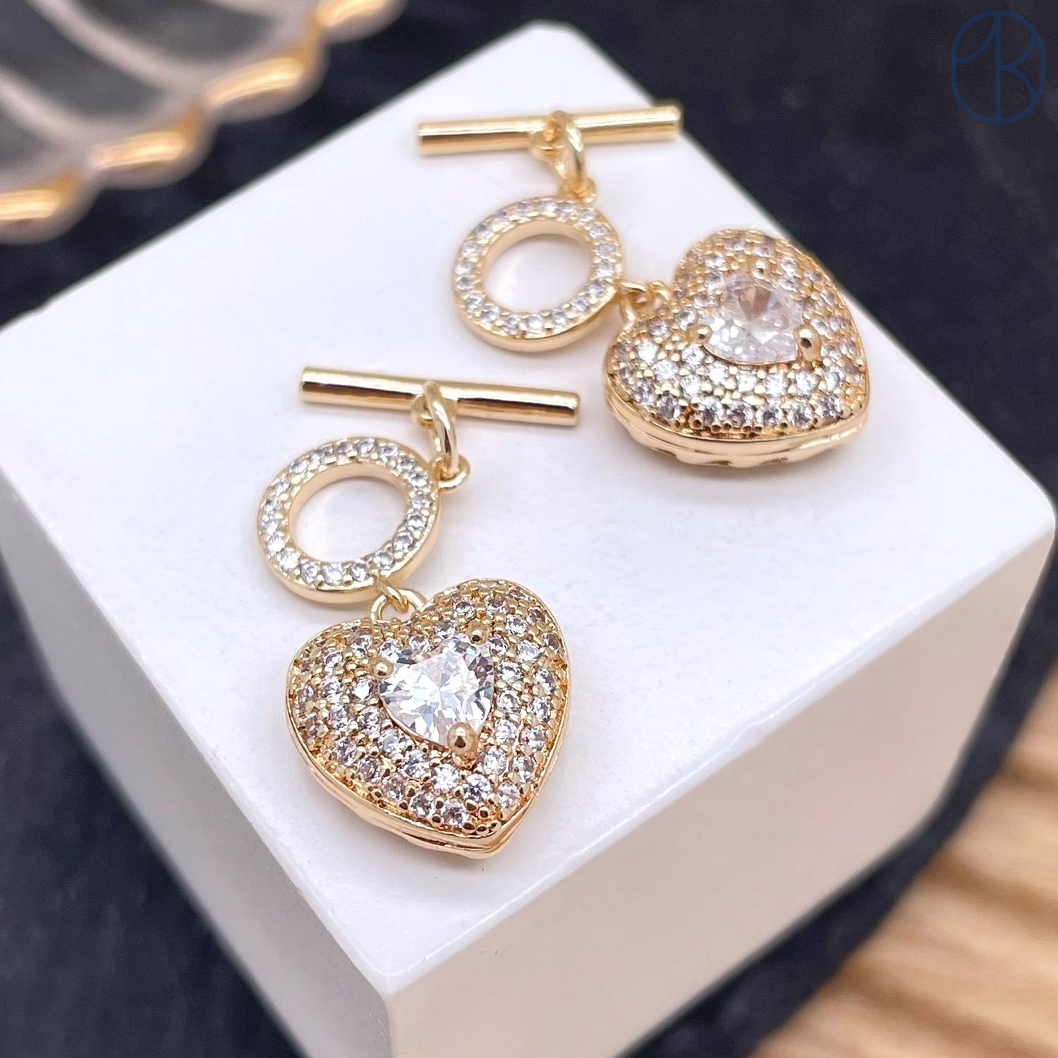 Замок тогл с подвеской сердце цирконы, цвет золото 12 мм