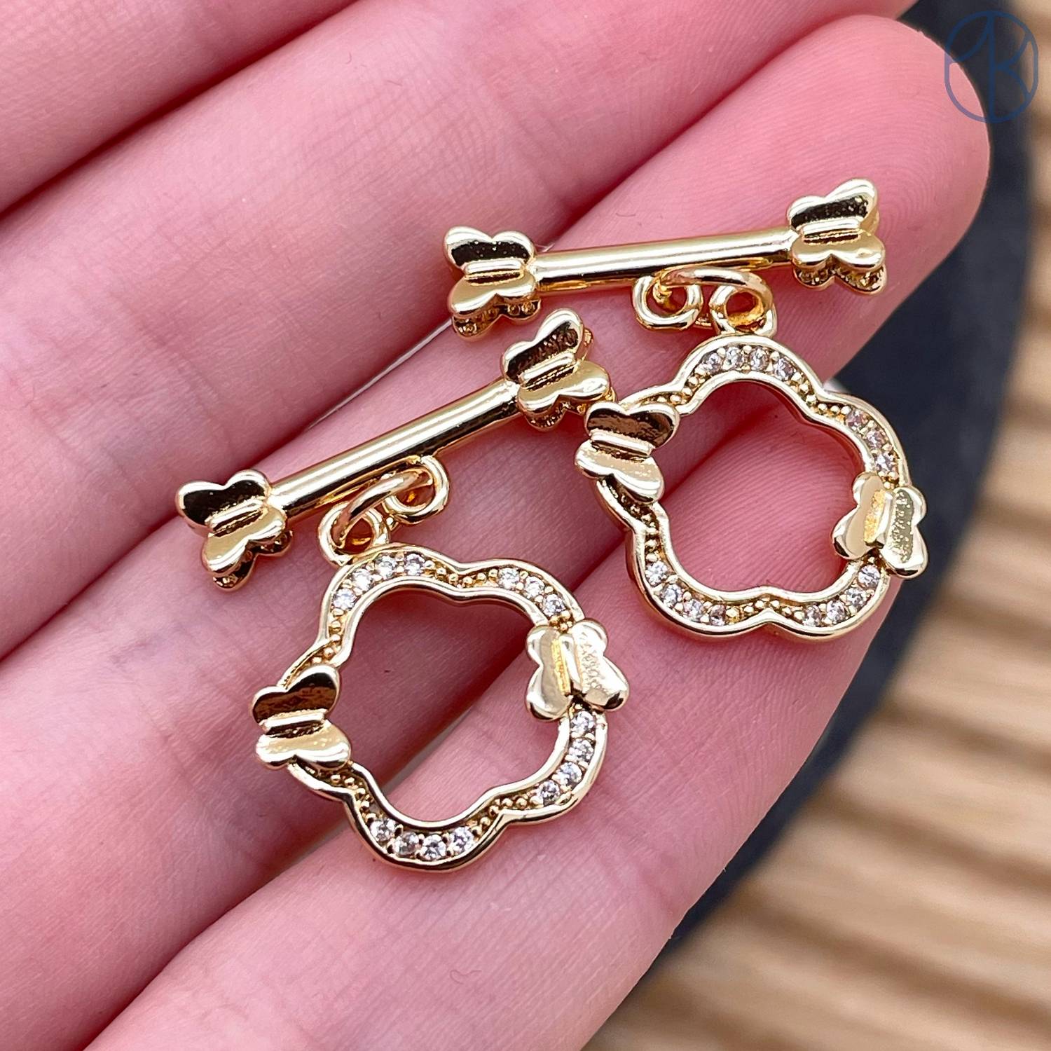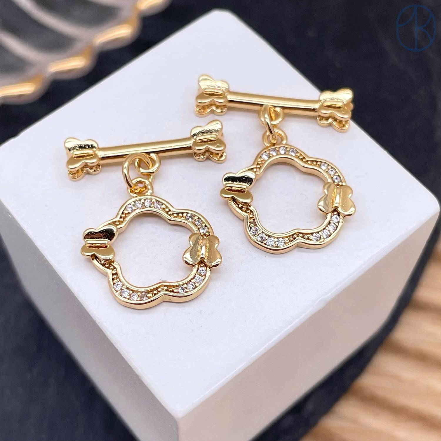 Замок тогл цветок и бабочки цирконы, цвет золото 18 мм